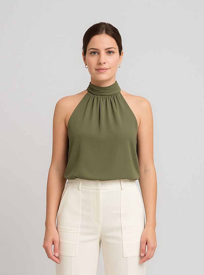 Confeccionada em crepe leve, esta blusa apresenta caimento fluido e elegante, ideal para composições que equilibram sofisticação e conforto. Sua modelagem halter neck destaca os ombros com sutileza, enquanto a gola alta franzida valoriza o colo e adiciona um toque refinado ao visual.