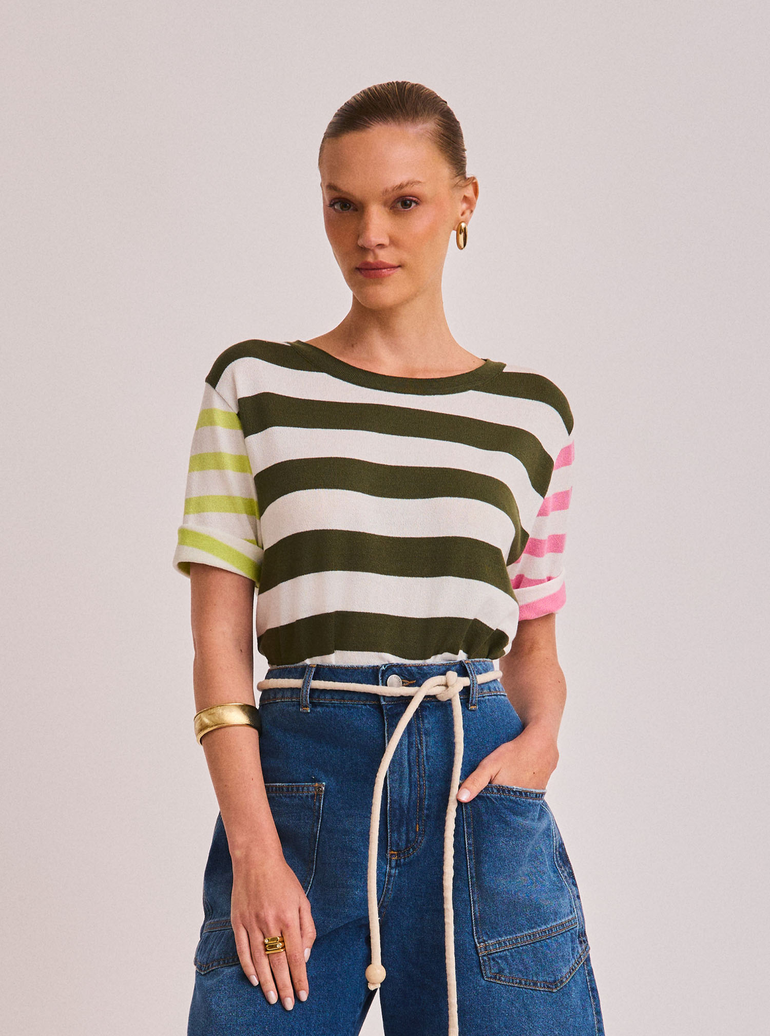 Confeccionada em tricot leve e confortável, esta blusa combina versatilidade e estilo. Com modelagem reta e gola redonda, destaca-se pelo detalhe das listras nas mangas e no corpo, que adicionam charme e modernidade à peça. Fácil de combinar, transita com elegância entre looks casuais e produções mais elaboradas, trazendo um ar descomplicado e sofisticado.