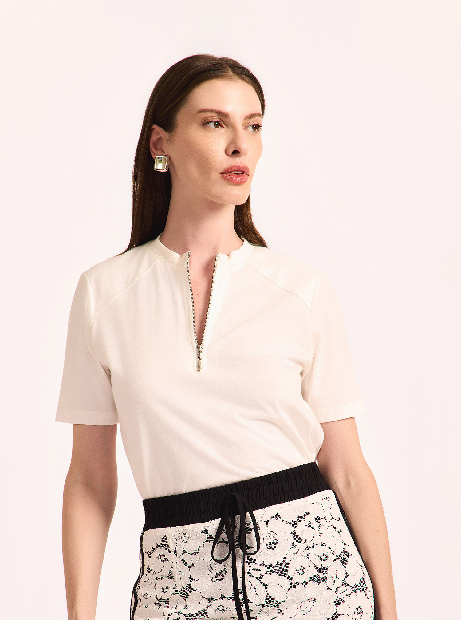 T-shirt confeccionada em algodão, garantindo toque macio, conforto e excelente respirabilidade para o uso diário. A modelagem reta proporciona caimento leve e confortável, vestindo bem diferentes biotipos. O design apresenta gola careca com abertura frontal em zíper, um detalhe moderno que valoriza a peça e permite variações de estilo, do casual ao levemente sofisticado. As mangas curtas e o acabamento clean reforçam a versatilidade, tornando a t-shirt ideal para composições casuais, urbanas ou contemporâneas, podendo ser usada sozinha ou em sobreposições.
