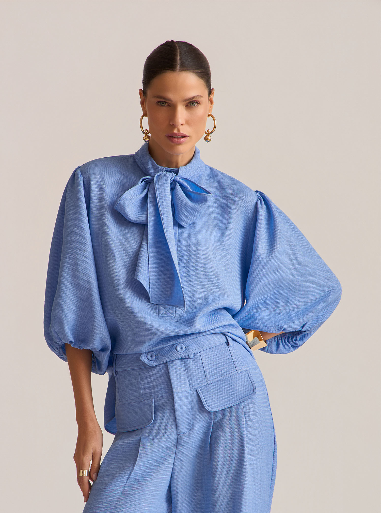 A peça apresenta shape soltinho, pala larga com botões embutidos, colarinho estruturado e mangas bufantes que adicionam volume e sofisticação.