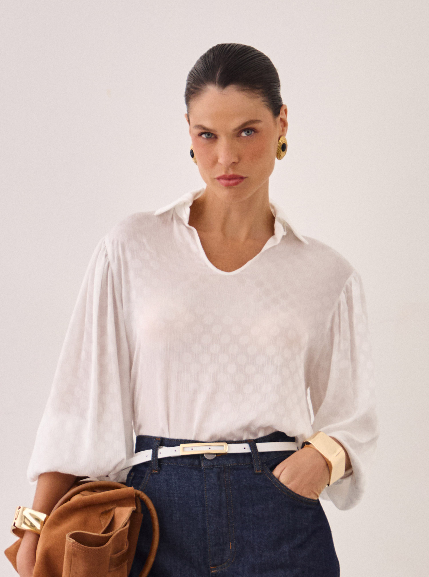 Confeccionada em satin jacquard com delicado poá, esta blusa une sofisticação e leveza. Sua modelagem ampla proporciona conforto e fluidez, enquanto o brilho acetinado do tecido adiciona um toque refinado. As mangas longas com elástico no punho criam um efeito bufante, e a amarração no decote permite diferentes formas de uso — mais solta ou com um laço delicado. Disponível nas variantes off-white e azul, é perfeita para ocasiões casuais ou elegantes, compondo looks femininos e contemporâneos.