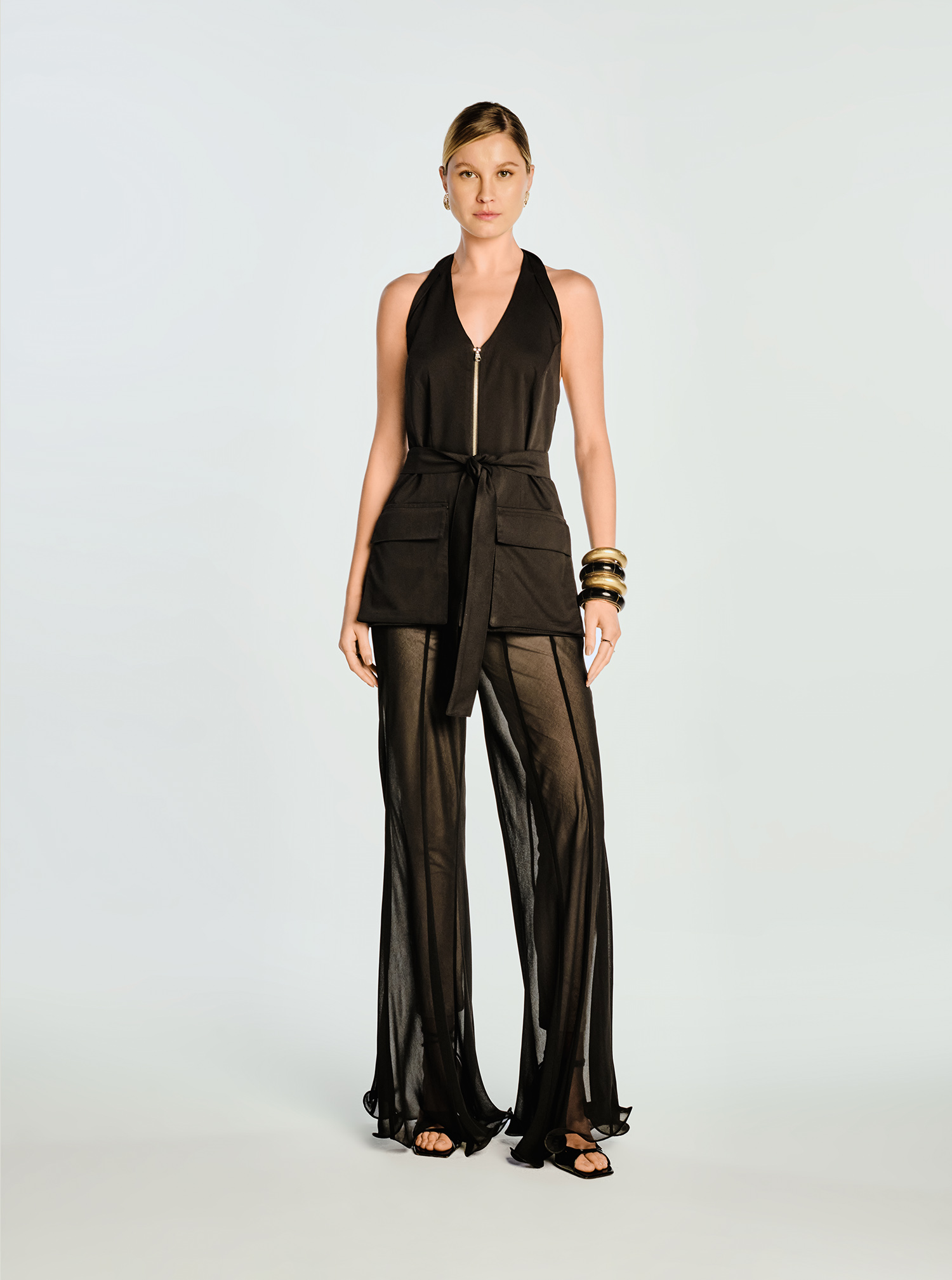 Esta calça feminina, confeccionada em musseline preta com transparência, é a peça ideal para um visual moderno e sofisticado. Totalmente cortada no viés, ela proporciona um caimento fluido e elegante, valorizado pelo acabamento ondulado na barra, que cria movimento, e pelo viés com amarração na base, conferindo o estiloso efeito Aladim. A peça conta com uma legging bege interna que garante conforto e segurança, além de recortes frontais e traseiros que modelam a silhueta. O cós com zíper invisível lateral assegura um ajuste perfeito. Versátil, a calça pode ser usada de forma sofisticada, evidenciando a transparência, ou em uma proposta despojada chic.