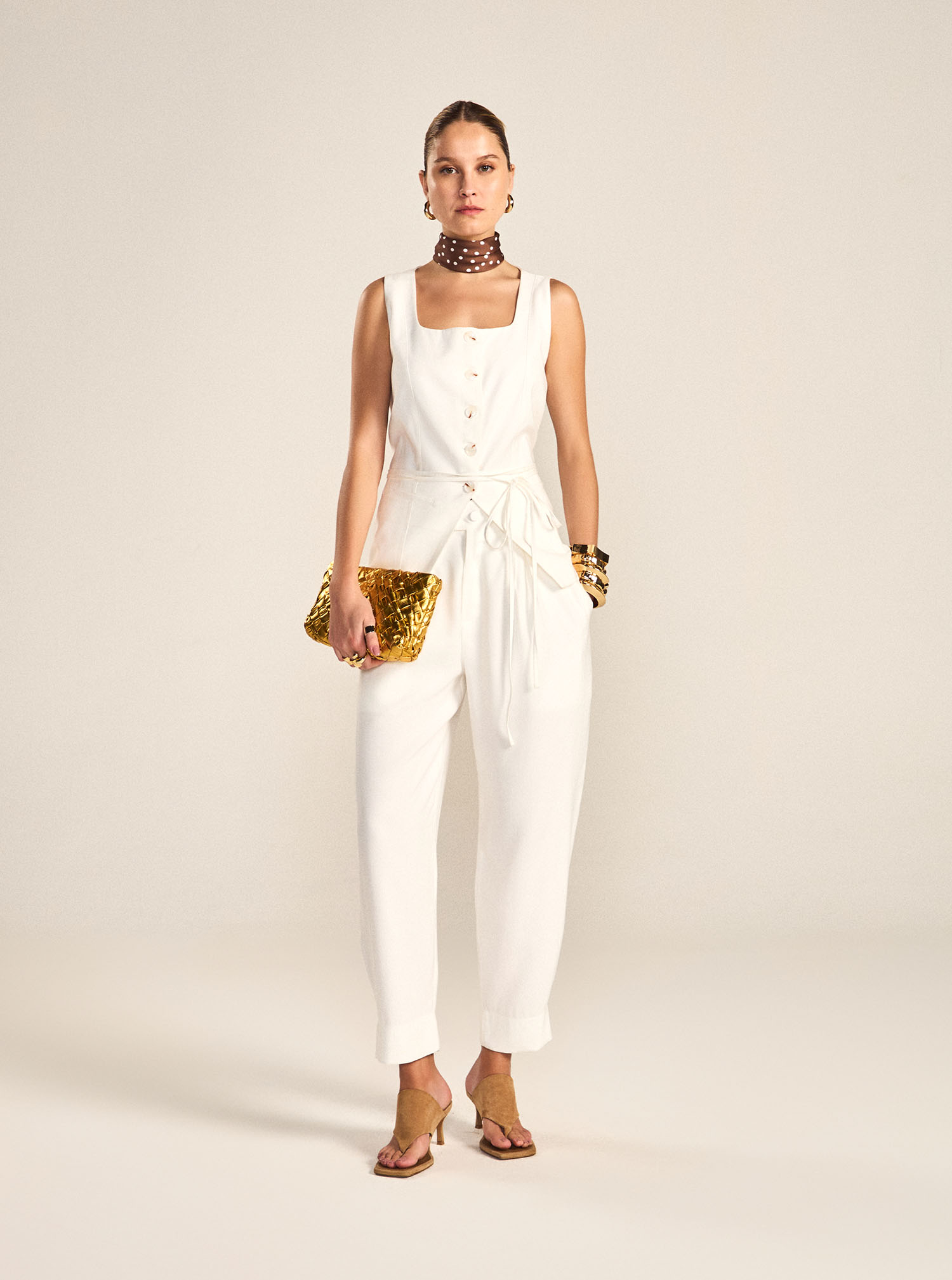 Confeccionada em tecido alfaiataria texturizada leve, a calça traduz elegância descomplicada com toque contemporâneo. A tonalidade off white é sofisticada e perfeita para composições neutras e versáteis. Com cós liso e discreto, fechamento frontal com zíper e pregas posicionadas na parte frontal, apresenta mood minimalista e caimento reto que valoriza a silhueta. A combinação dos elementos cria um visual clean e atemporal, ideal para ocasiões casuais e produções mais refinadas.