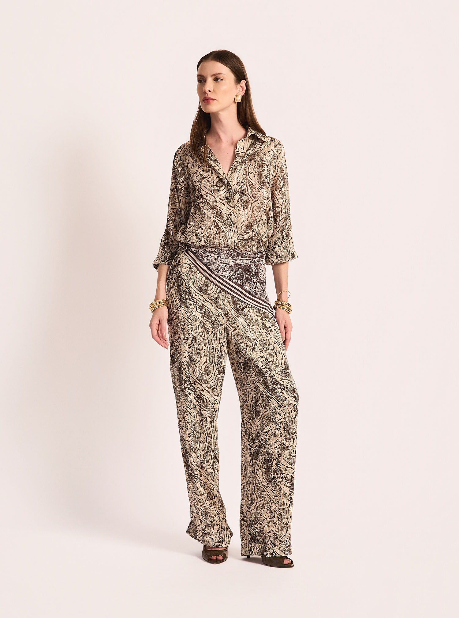 Calça confeccionada em tecido leve, que oferece conforto e praticidade sem abrir mão do estilo. O modelo apresenta cintura alta, valorizando a silhueta, e modelagem reta com caimento soltinho, garantindo liberdade de movimento e visual elegante. A estampa orgânica em tons neutros adiciona um toque moderno e versátil à peça, permitindo composições sofisticadas em conjuntos ou combinações equilibradas com peças lisas. Versátil, transita com facilidade entre looks casuais e produções mais refinadas.
