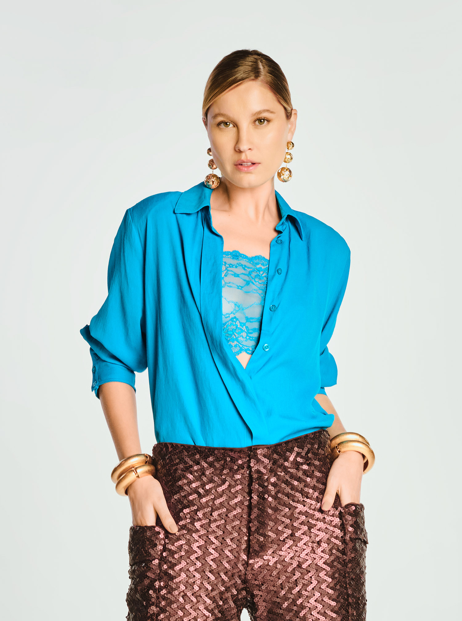 Uma peça versátil e sofisticada, a camisa em crepe azul cativa pelo caimento fluido e acabamento impecável. Seu tecido leve proporciona movimento e elegância, enquanto a modelagem oversized garante um toque contemporâneo e despojado. Com mangas longas ajustáveis por botões e colarinho clássico, ela é perfeita para composições que transitam entre o casual e o refinado.