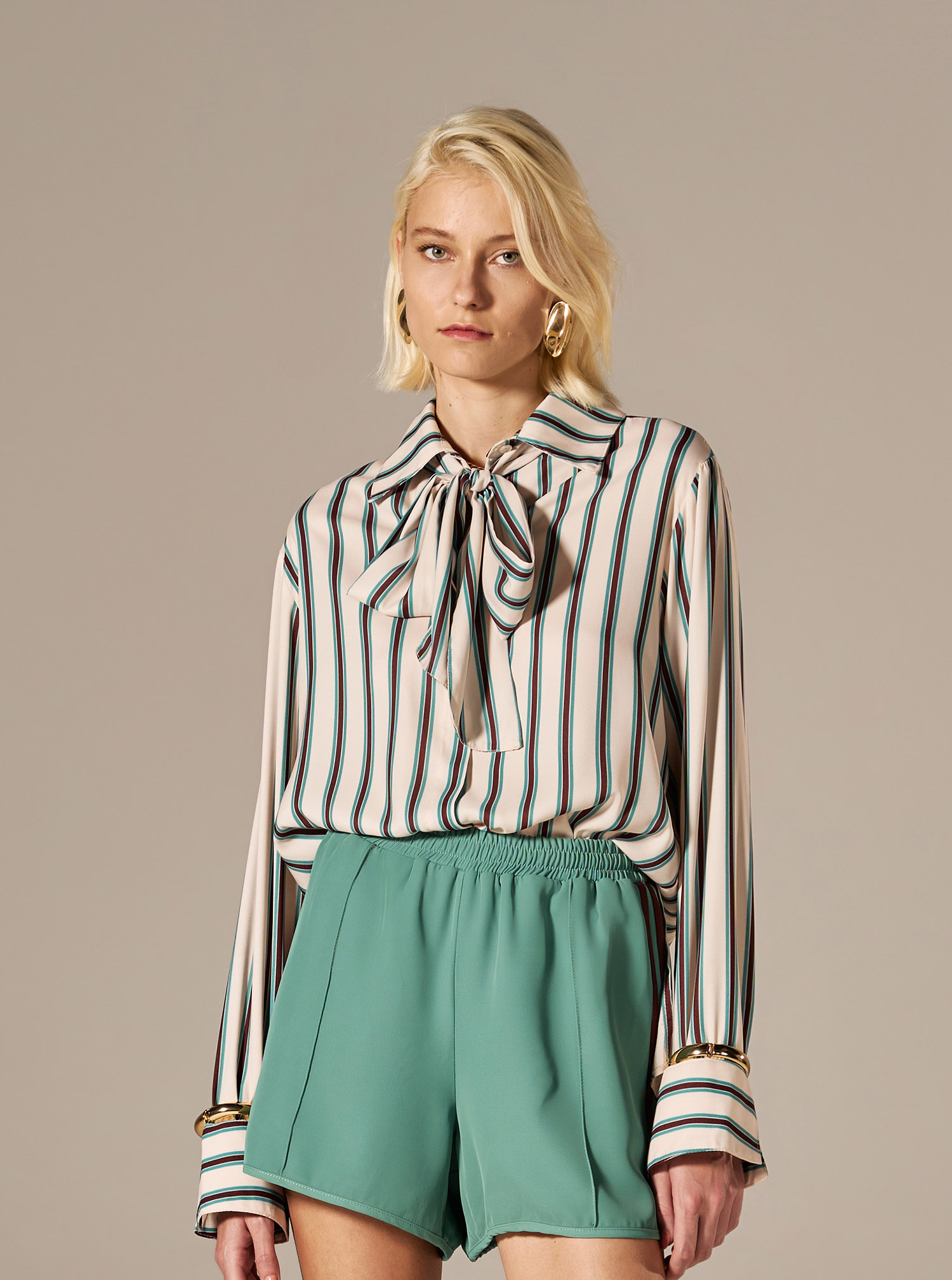 A estampa listrada elegante alonga a silhueta e traz um ar moderno e atemporal à peça. O grande destaque fica por conta da faixa no pescoço removível, que permite diferentes formas de uso — com laço para uma proposta mais sofisticada e refinada, ou sem a faixa para um visual mais clean e minimalista. A modelagem reta, o caimento confortável e as mangas longas completam o design elegante e versátil.
