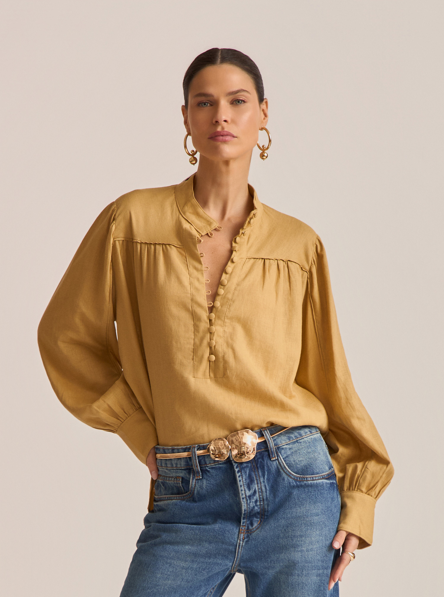 O abotoamento frontal completo com botões forrados pregados à mão destaca o cuidado artesanal e eleva o acabamento da peça.