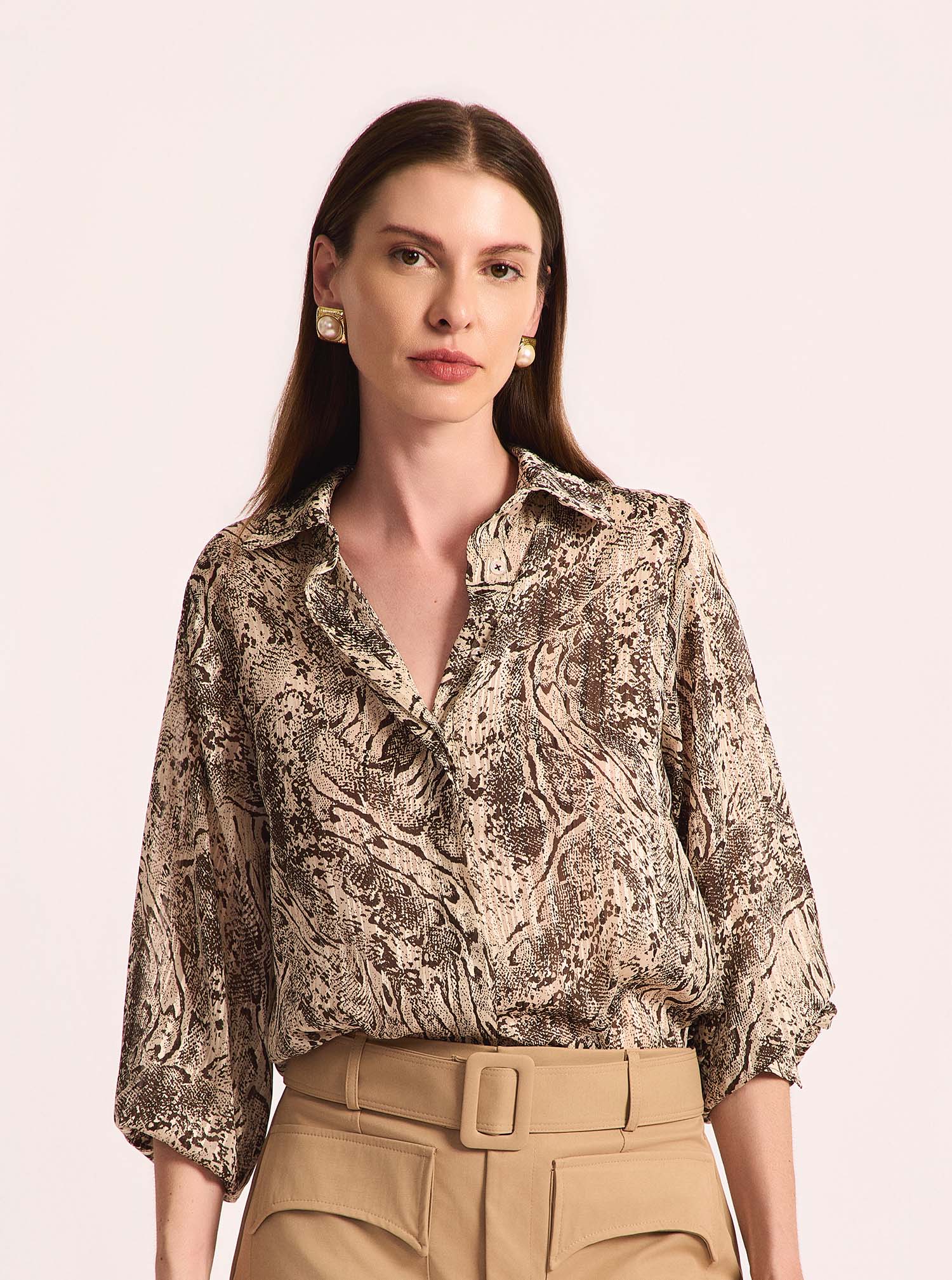 Camisa confeccionada em tecido leve e confortável, ideal para compor looks versáteis e sofisticados. O modelo apresenta manga longa, gola clássica e fechamento frontal por botões, garantindo um visual atemporal com toque moderno. A estampa orgânica em tons neutros adiciona personalidade à peça e facilita combinações com propostas casuais ou produções mais elegantes. O caimento soltinho proporciona conforto ao vestir e elegância natural, tornando a camisa perfeita para o uso diário ou ocasiões que pedem um visual refinado sem esforço.