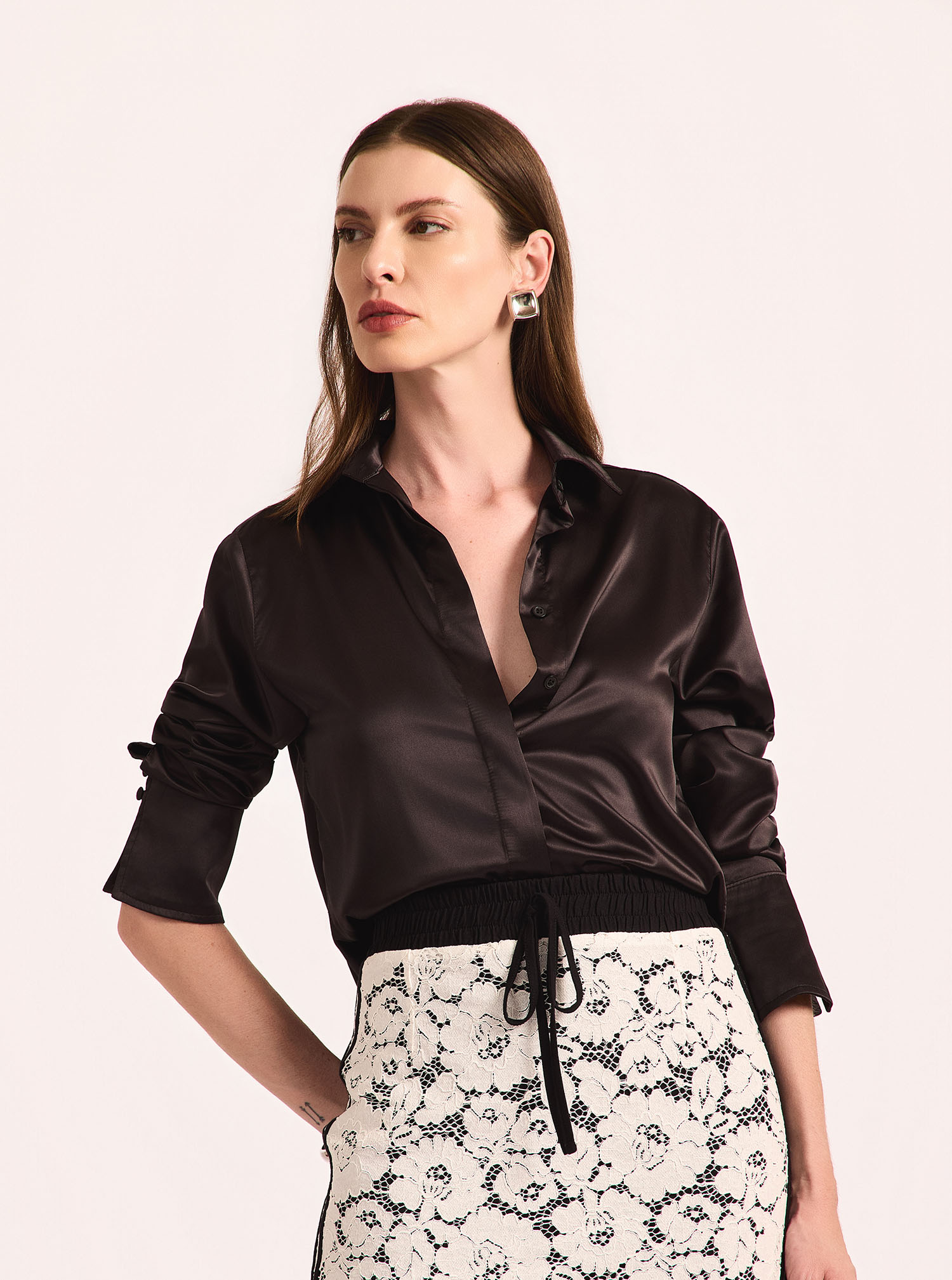 Camisa confeccionada em cetim, com toque acetinado, leve brilho e caimento fluido que confere sofisticação ao visual. O modelo apresenta gola clássica e fechamento frontal por botões, garantindo um design atemporal e versátil. As mangas longas com punhos acrescentam elegância à peça, enquanto a modelagem levemente ajustada valoriza a silhueta sem comprometer o conforto. Ideal para compor looks formais, produções de trabalho ou combinações refinadas para a noite, sendo uma peça curinga no guarda-roupa feminino.