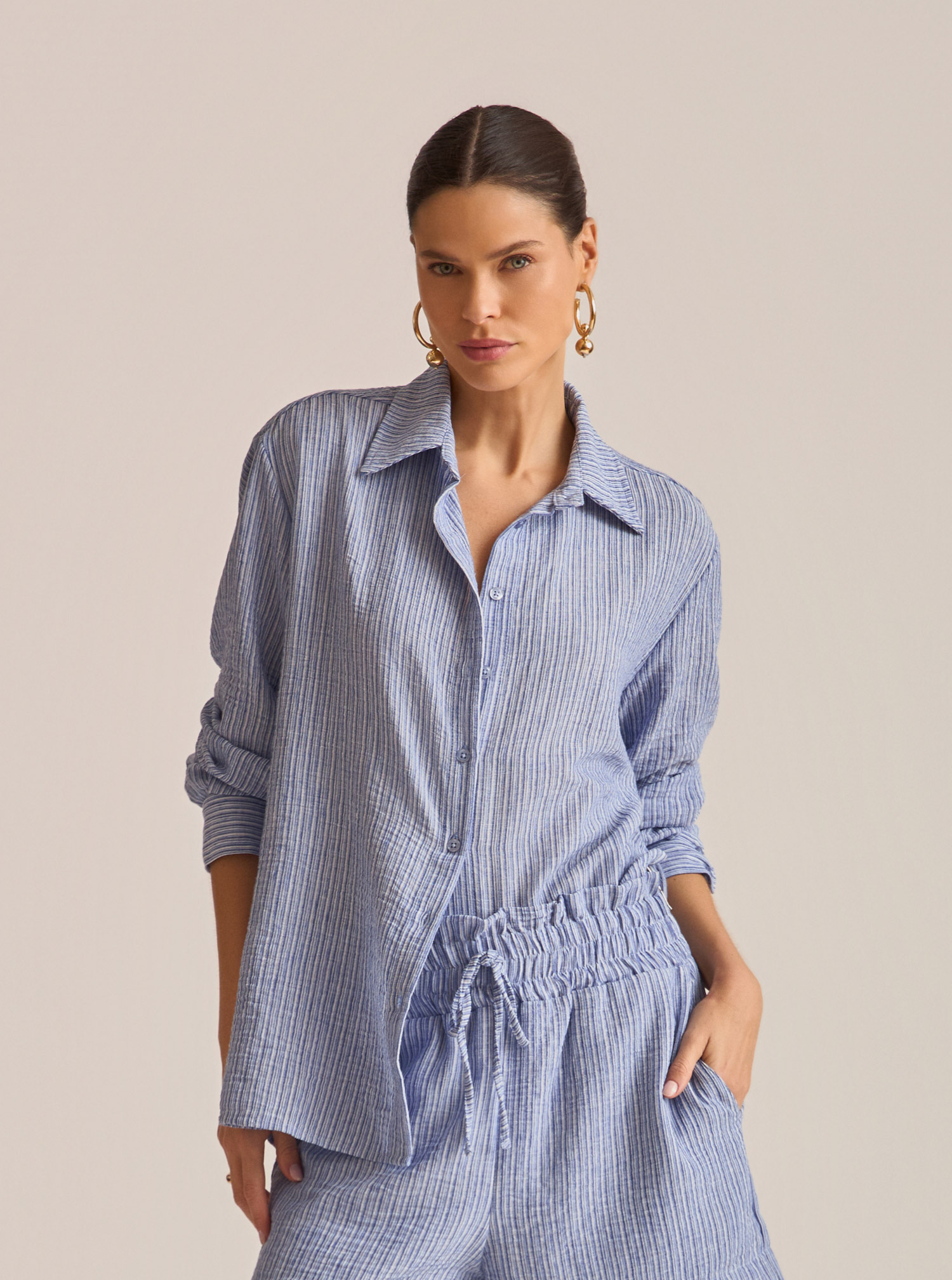 Camisa confeccionada em fio tinto listrado com textura, unindo sofisticação e modernidade em uma proposta atemporal e elegante.