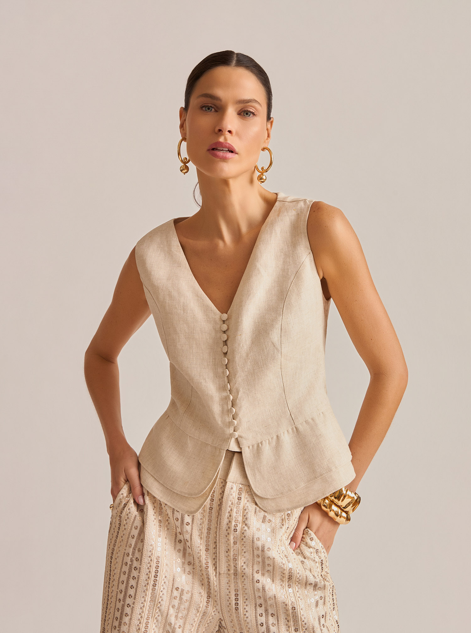 Colete feminino confeccionado em linho 100%, que combina elegância e frescor em uma peça atemporal.