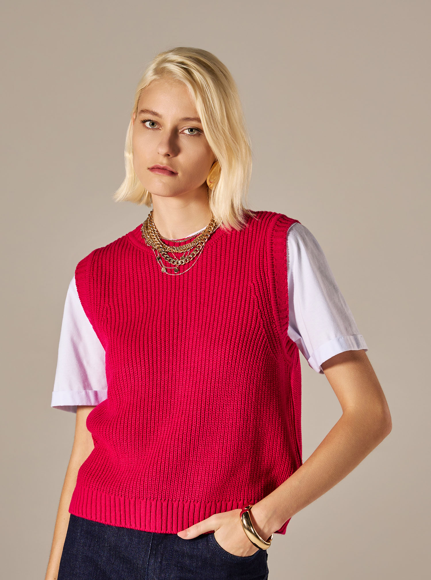 O modelo sem mangas apresenta gola careca com acabamento canelado, assim como as cavas e a barra, garantindo melhor ajuste e conforto. O design minimalista e contemporâneo facilita o uso em diferentes ocasiões, do casual ao mais sofisticado. A cor pink vibrante adiciona um toque de personalidade e modernidade.