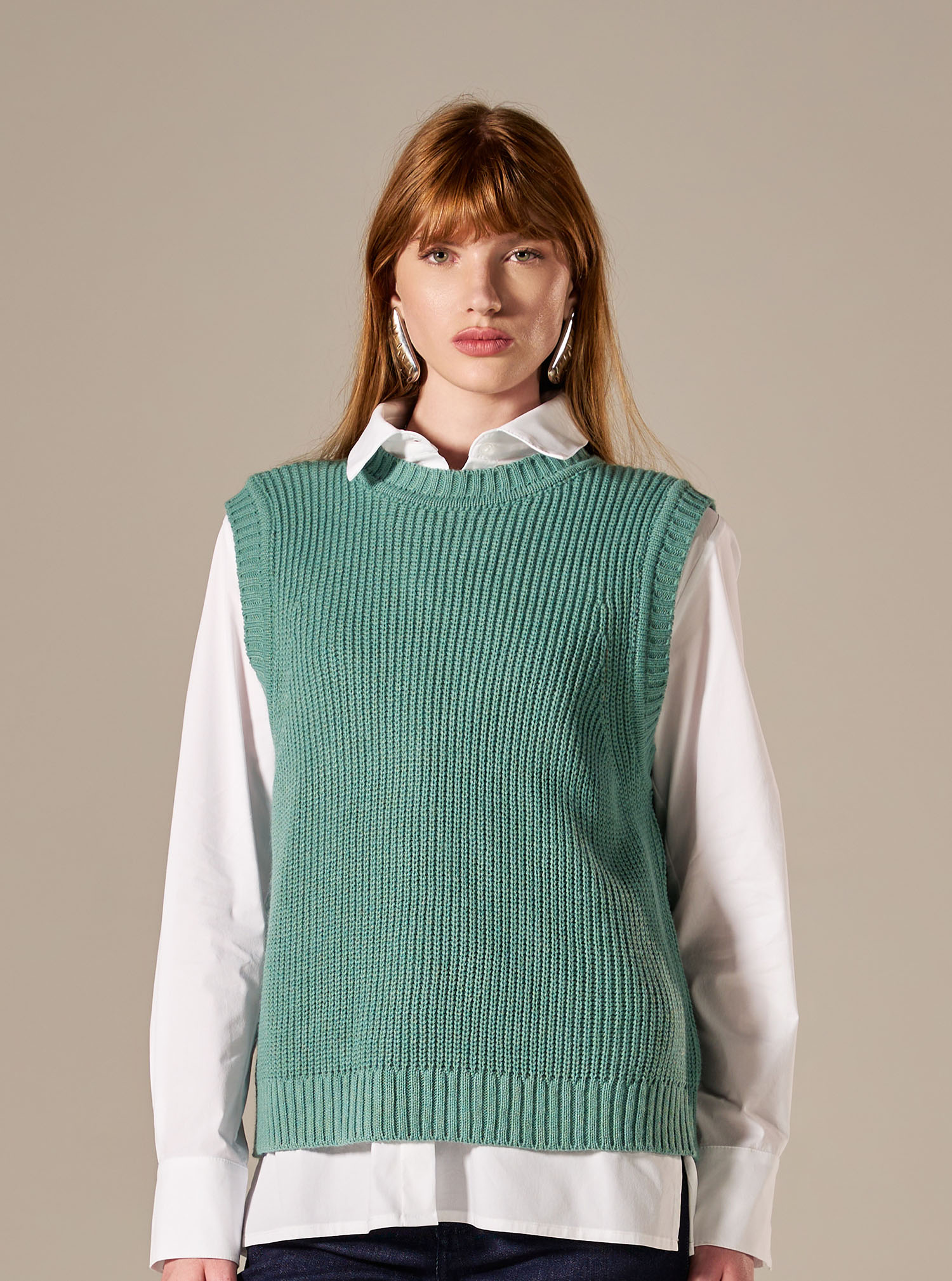 O modelo sem mangas apresenta gola careca com acabamento canelado, assim como as cavas e a barra, garantindo melhor ajuste e conforto. O design minimalista e contemporâneo facilita o uso em diferentes ocasiões, do casual ao mais sofisticado. A cor verde vibrante adiciona um toque de personalidade e modernidade.