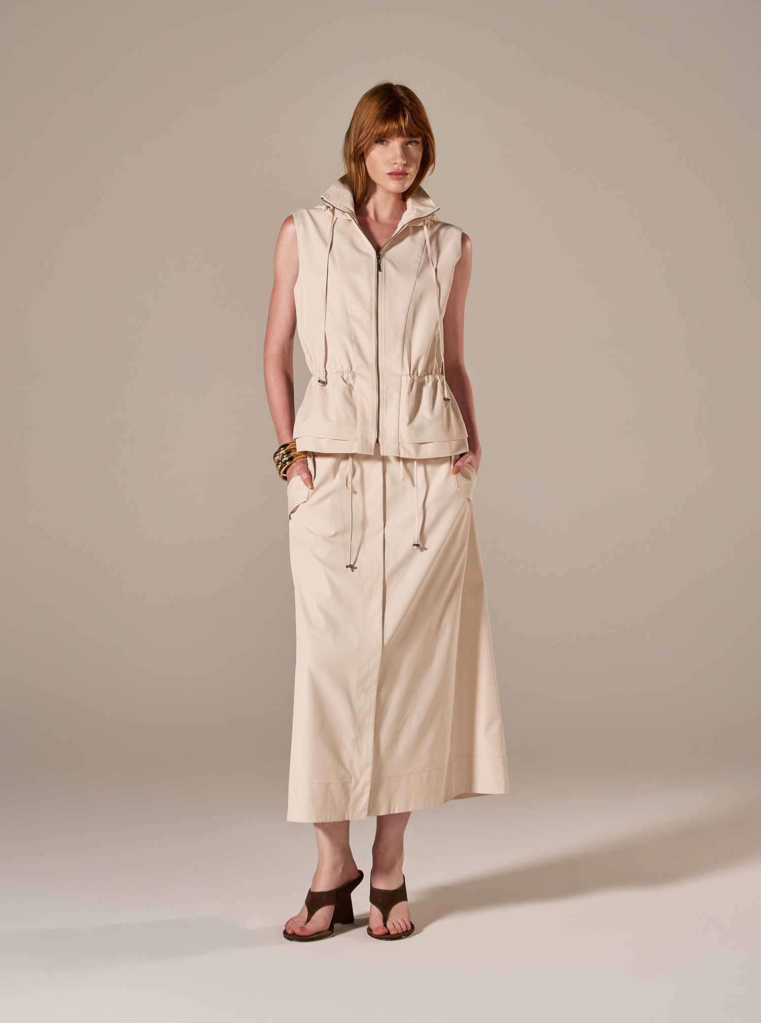 Composto por colete sem mangas e saia midi, o conjunto traz um visual clean e acabamento refinado. O colete possui modelagem ajustada, fechamento frontal por zíper metálico, gola aberta estruturada e recortes estratégicos que valorizam a silhueta, além de bolsos funcionais que agregam praticidade e estilo. A saia midi apresenta modelagem reta com caimento fluido, recortes verticais que alongam a silhueta.