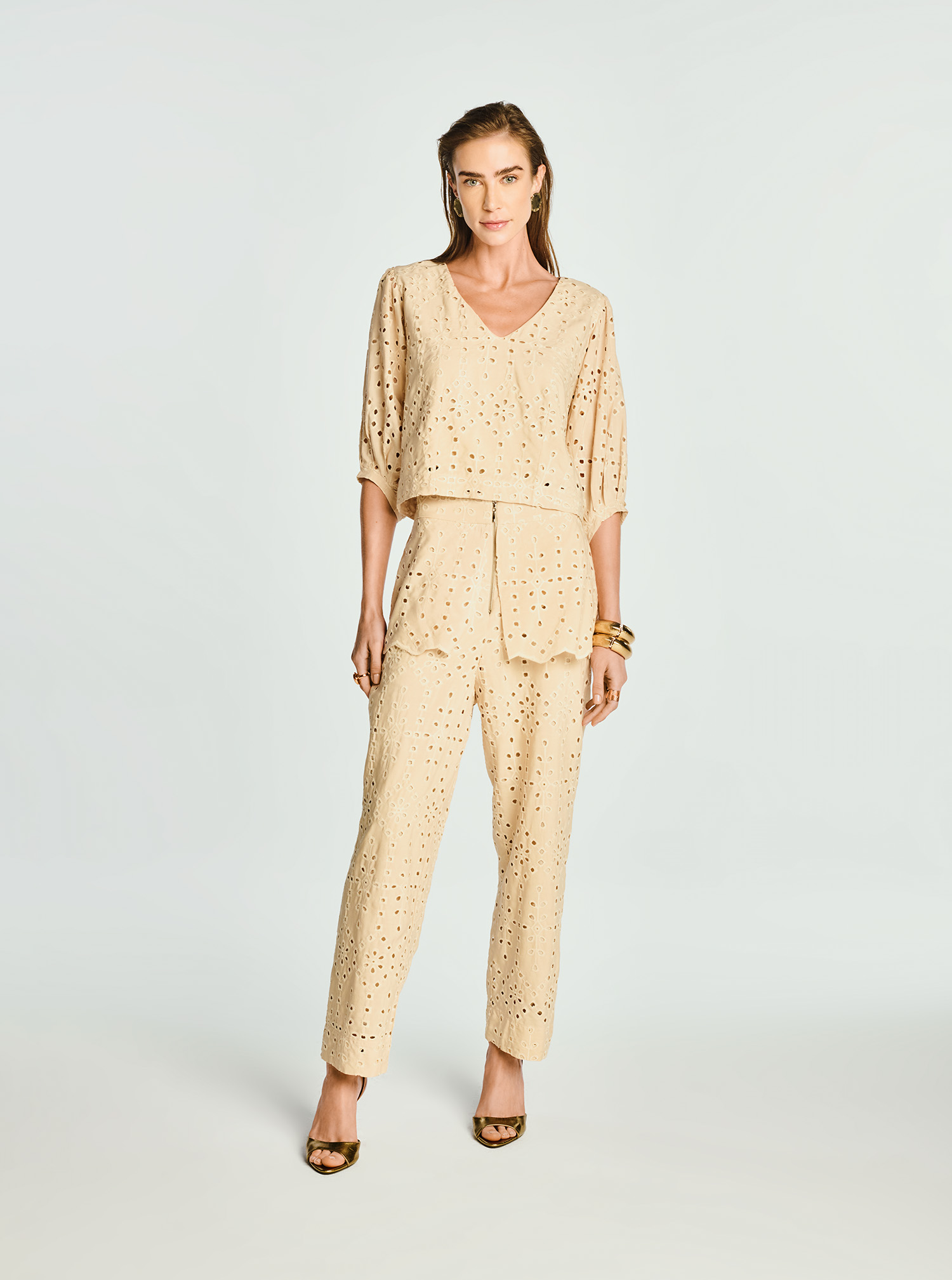 Este conjunto feminino, composto por blusa e calça, é a personificação da leveza, sofisticação e autenticidade. Confeccionado em laise de viscose e liocel, na delicada cor pêssego, ele valoriza o desenho artesanal do tecido. A blusa possui um elegante decote V e mangas bufantes, com shape reto e forro que garante conforto e acabamento impecável. A calça, também forrada, apresenta modelagem reta com comprimento na altura do tornozelo e um detalhe de sobressaia com bico da laise na barra. O zíper frontal em metal na calça adiciona um toque moderno e sofisticado. Um conjunto elegante e versátil que transita com facilidade entre o look diurno e noturno.