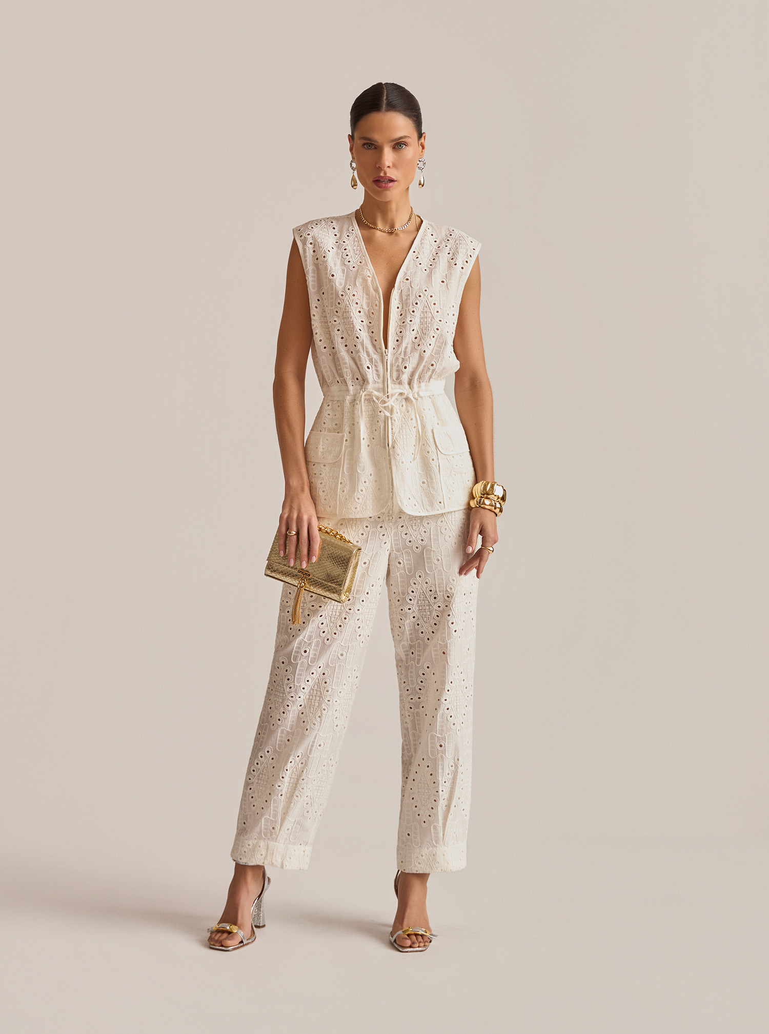 Conjunto confeccionado em laise de algodão, que une leveza e sofisticação em um visual atemporal.