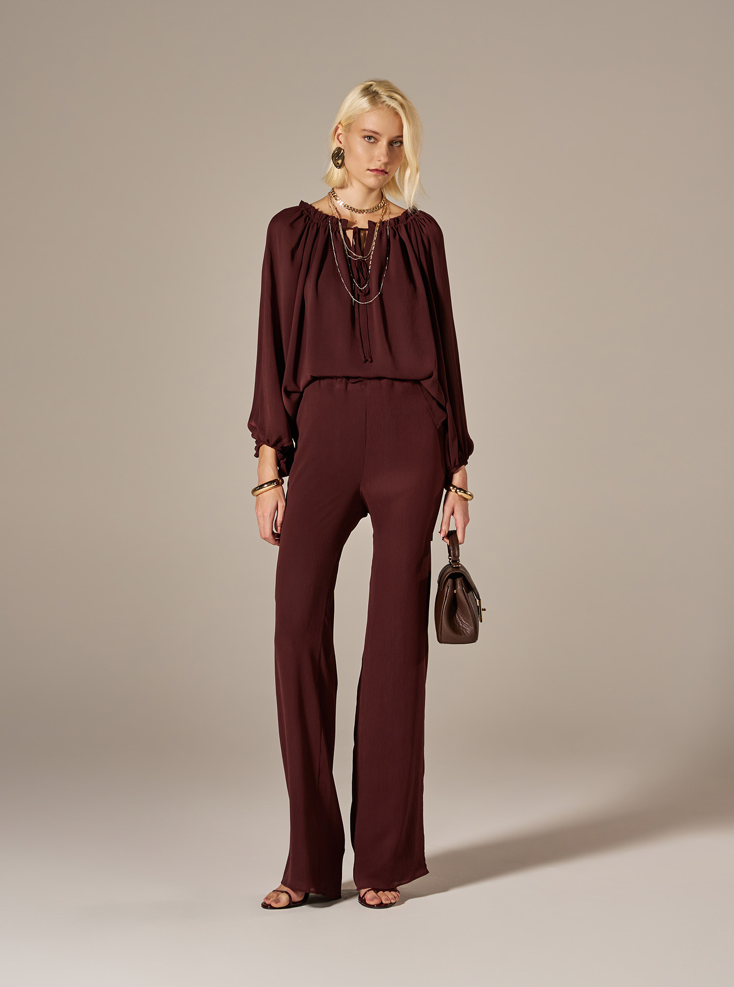 Composto por blusa com detalhe elástico no decote e calça de modelagem reta, o conjunto oferece leveza e a respirabilidade que você procura. A blusa com detalhe elástico proporciona um visual moderno e sofisticado, enquanto a calça de modelagem reta valoriza a silhueta. O design clean e atemporal facilita o uso em diferentes ocasiões.
