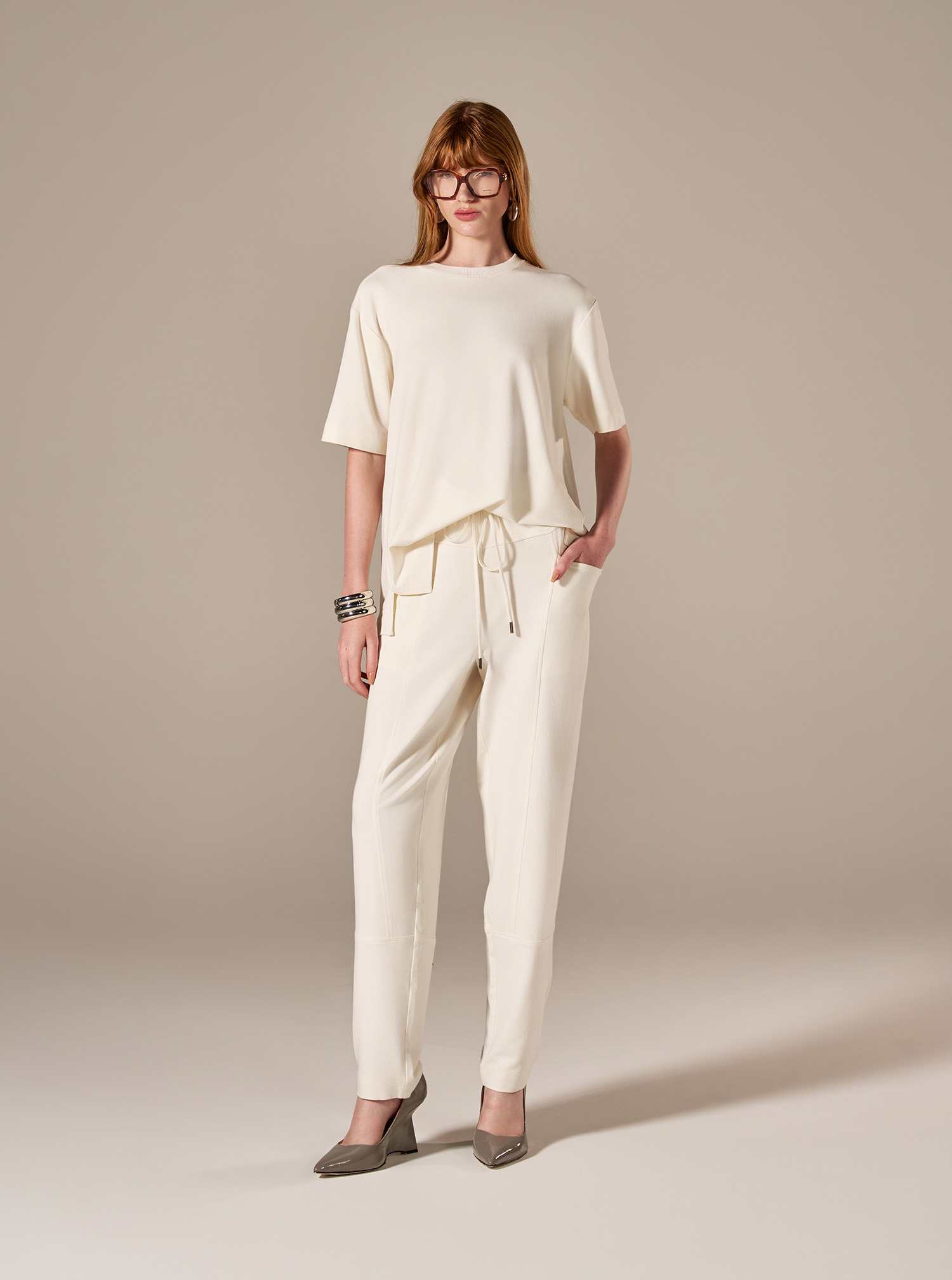 Composto por blusa e calça, o conjunto apresenta uma blusa com gola careca e mangas curtas, oferecendo um visual clean e atemporal. A calça possui bolsos frontais funcionais, que agregam praticidade e utilidade à peça. O design minimalista e versátil facilita o uso em diferentes ocasiões, do casual ao mais sofisticado.