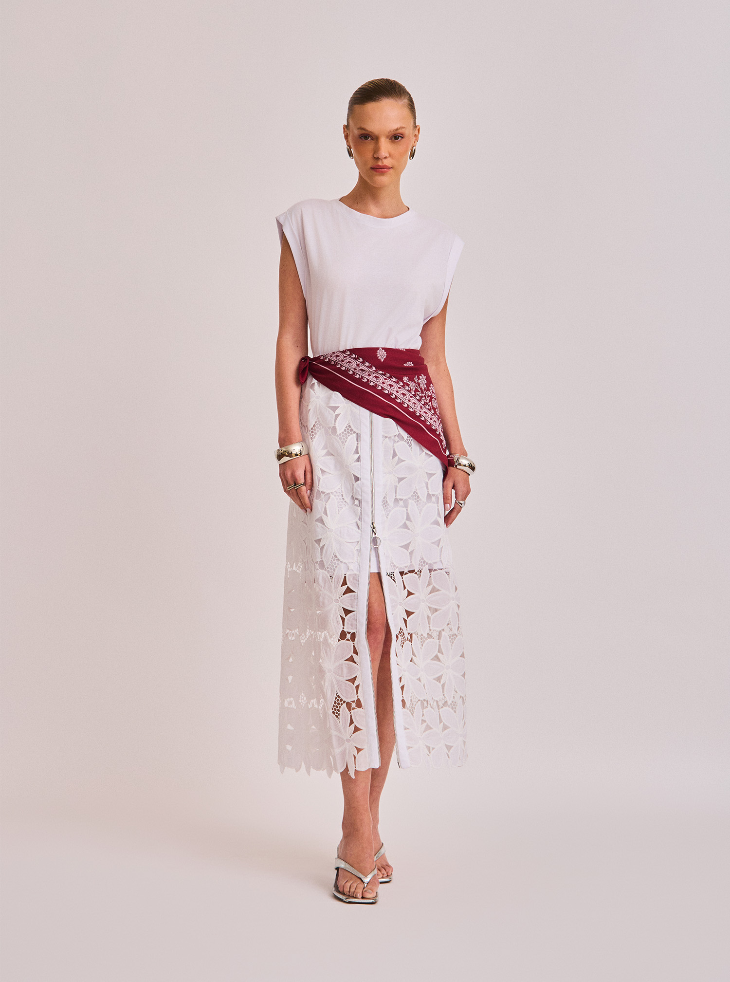 Conjunto na cor branca que combina a casualidade da malha com a sofisticação do guipire. A parte superior, em malha macia, possui modelagem reta e caimento solto, oferecendo conforto e estilo despojado. A saia midi em guipire adiciona elegância, com leve transparência e fechamento frontal com zíper de metal.