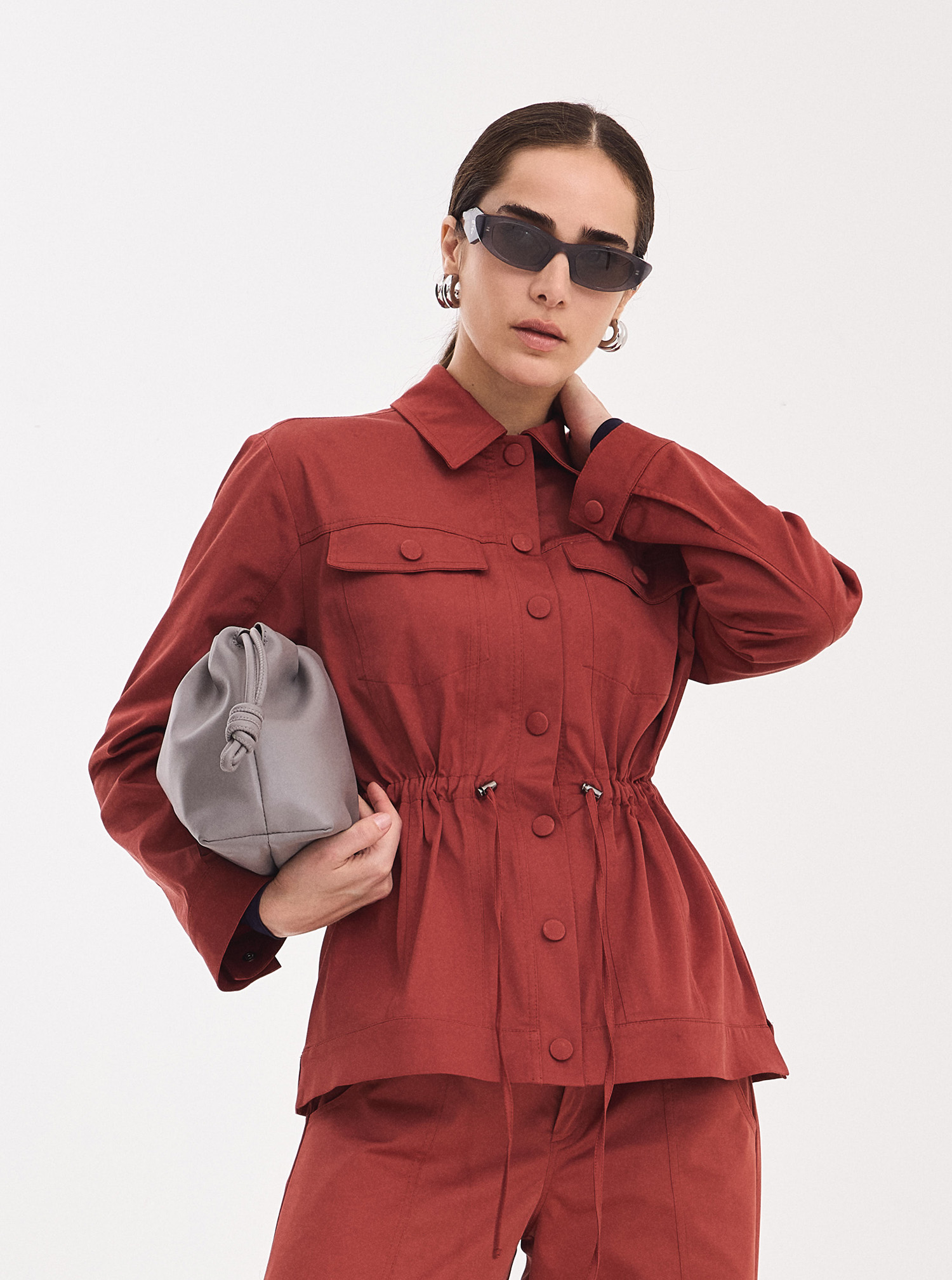 A modelagem da Jaqueta Jolie é levemente acinturada, apresentando uma gola colarinho clássica e mangas longas com punhos ajustáveis por abotoamento, permitindo diferentes formas de uso. O grande diferencial desta peça é o cordão para amarração na cintura, um detalhe estratégico que permite ajustar a silhueta conforme o desejo, criando um efeito visual esculpido e moderno. O fechamento frontal por botões de pressão encapados garante uma estética limpa e um acabamento refinado de alta costura. Com bolsos frontais adornados por lapelas decorativas e pespontos aparentes que evidenciam o cuidado artesanal da Raizz, esta jaqueta é perfeita para compor conjuntos monocromáticos com a Bermuda Jolie ou para elevar um look casual com jeans e sandálias de salto. É a expressão máxima de atitude e elegância.