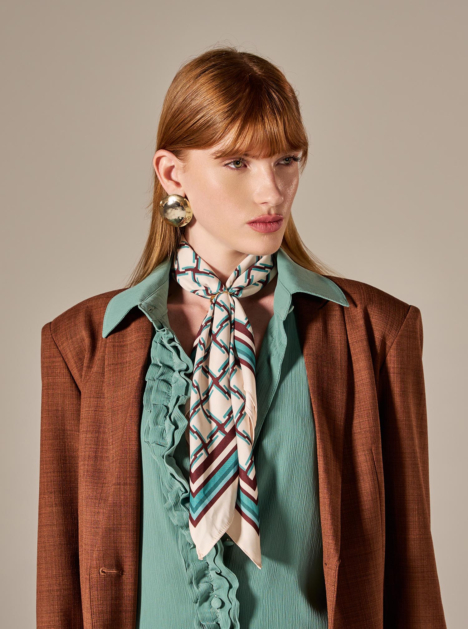 Lenço feminino com estampa geométrica exclusiva, pensado para adicionar sofisticação e personalidade às produções do dia a dia. O desenho geométrico em padrão harmonioso, desenvolvido em tons neutros e elegantes, é valorizado pela borda contrastante, que confere um acabamento clássico e atemporal à peça.