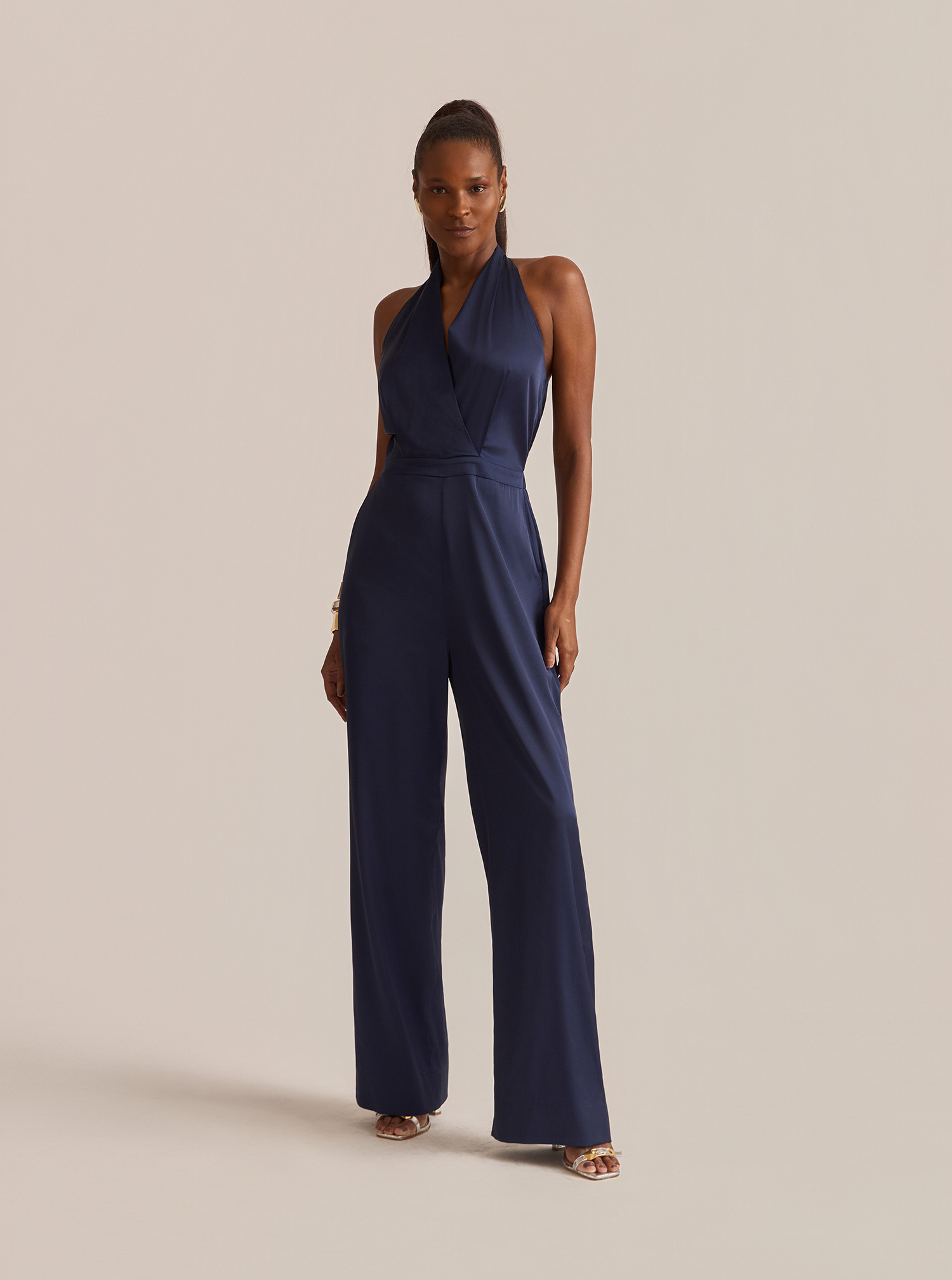 Macacão feminino confeccionado em tecido acetinado na cor marinho, que confere caimento fluido e brilho sofisticado.