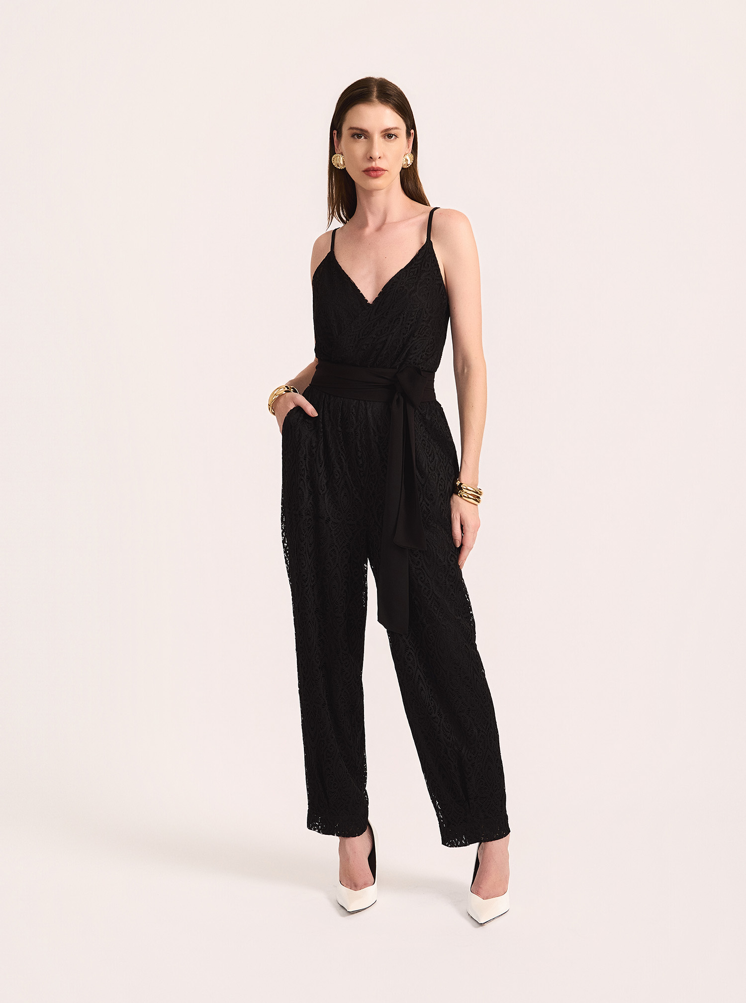 Macacão confeccionado em renda delicada, que une sofisticação, feminilidade e conforto em uma proposta elegante e atemporal. O modelo conta com forro interno, garantindo segurança ao vestir e excelente caimento. O decote transpassado em V valoriza o colo com elegância, enquanto as alças finas adicionam leveza ao visual. A modelagem de pernas longas alonga a silhueta, e a faixa para amarração na cintura permite ajuste personalizado, destacando a região de forma harmoniosa. A renda traz textura e charme à peça, tornando-a ideal para ocasiões especiais, eventos noturnos ou produções sofisticadas com toque moderno.