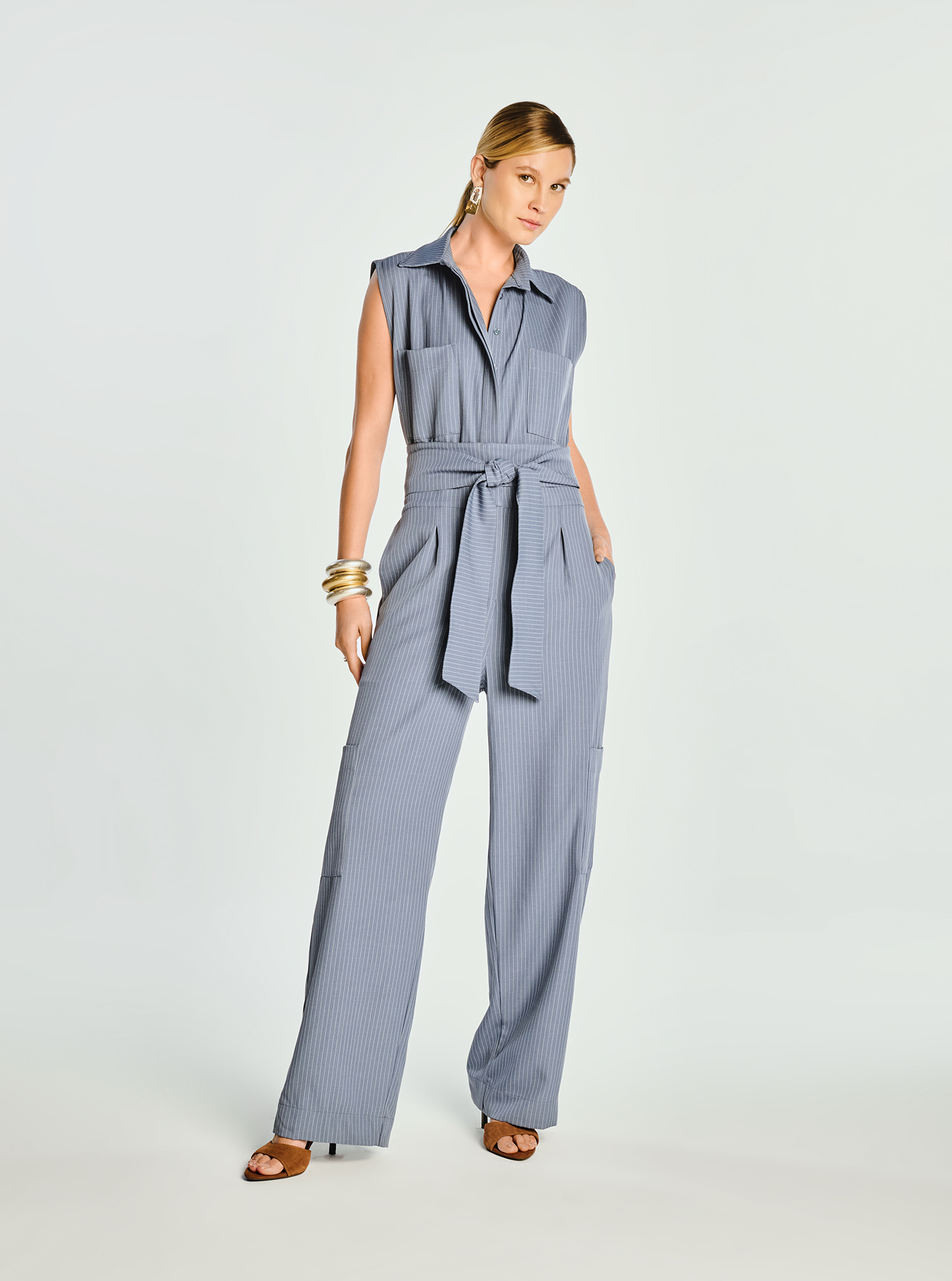 Este macacão feminino é um clássico contemporâneo da alfaiataria, unindo sofisticação e conforto em uma peça curinga e versátil. Confeccionado em alfaiataria leve cinza com risca de giz, ele possui um caimento elegante e impecável. O modelo apresenta uma cava mais aberta e ombro estilo muscle, conferindo um visual moderno. O patô embutido, bolsos frontais funcionais e cós reto com fechamento interno e zíper garantem um acabamento refinado. A calça pantalona possui bolsos laterais práticos. O modelo acompanha cinto faixa do mesmo tecido, ideal para marcar a cintura e personalizar o look.