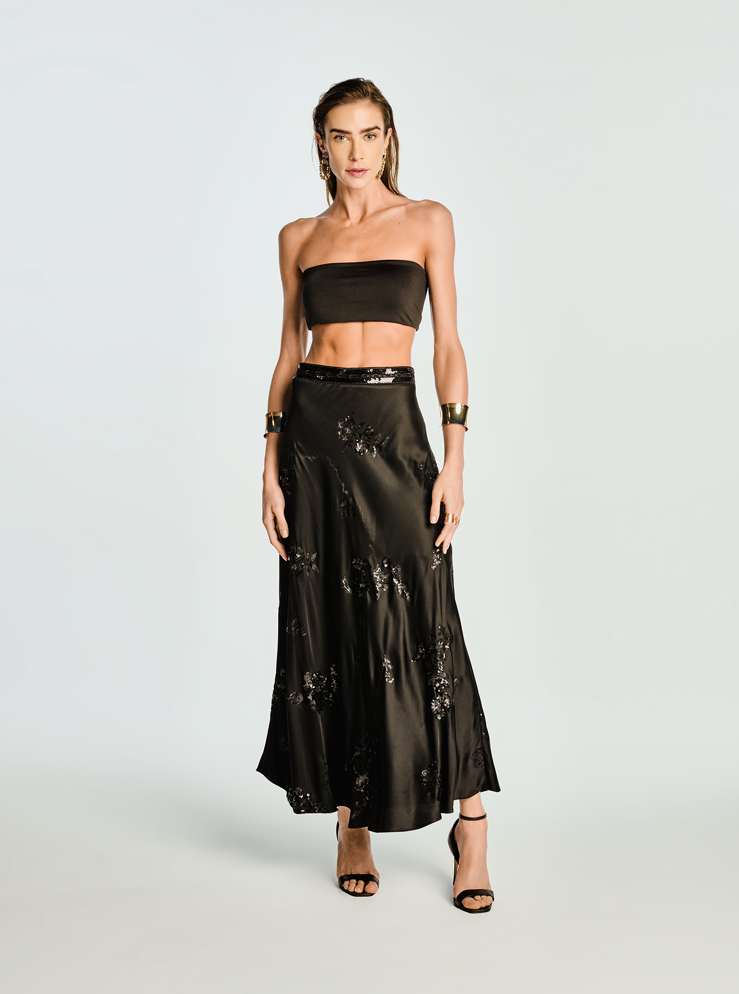 Saia Midi Bordada Paetê Preta Jaine. Esta elegante saia é confeccionada em tecido acetinado bordado na cor preta, combinando sofisticação e detalhes requintados para um visual deslumbrante. Com comprimento longo, a saia apresenta um caimento solto que proporciona movimento e fluidez, ideal para eventos especiais e ocasiões formais. O cós alto é adornado com uma faixa de paetê, adicionando um toque de brilho e glamour à peça. Para garantir um ajuste perfeito e conforto, a saia possui um zíper lateral discreto. Além disso, a peça é completamente forrada, assegurando um acabamento impecável e proporcionando conforto ao vestir. Esta saia em tecido acetinado bordado é a escolha perfeita para quem deseja destacar-se com elegância e estilo, seja em festas, jantares ou eventos formais. Longa Cós alto Paetês