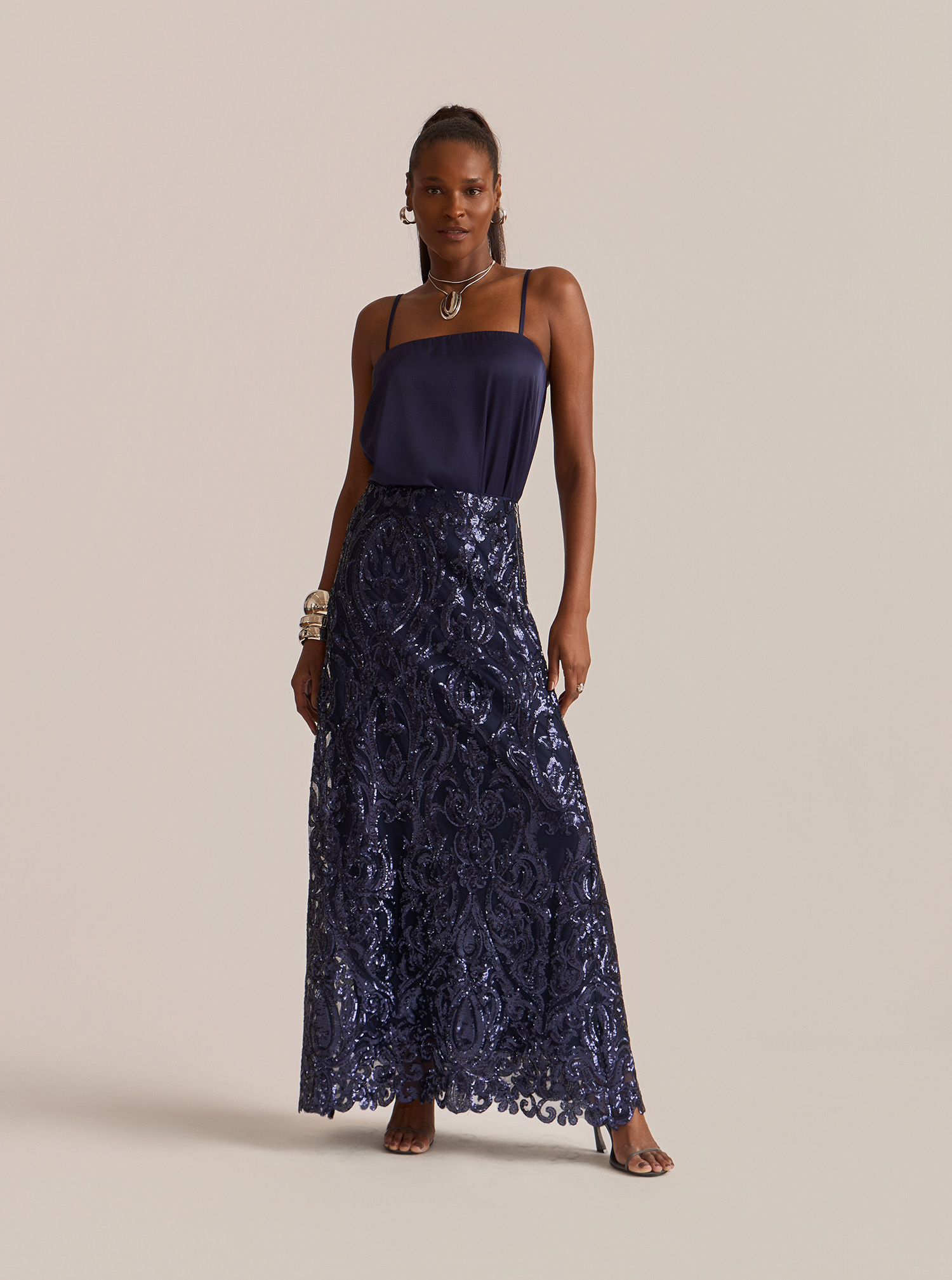 Saia longa confeccionada em tule bordado azul marinho, que une sofisticação em uma proposta atemporal.