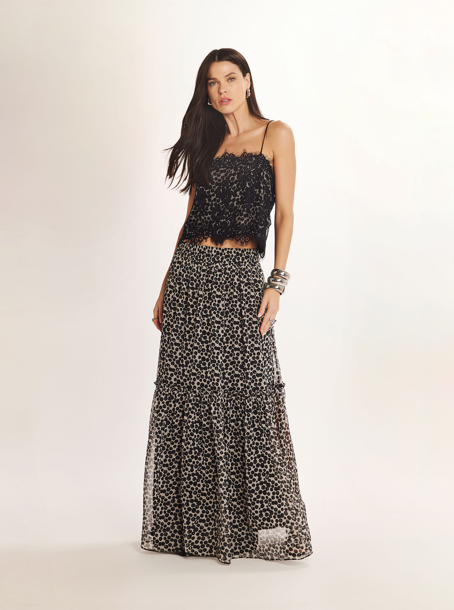 Confeccionada em tecido leve off white com estampa de poá preto, esta saia longa garante fluidez, movimento e um visual sofisticado.
