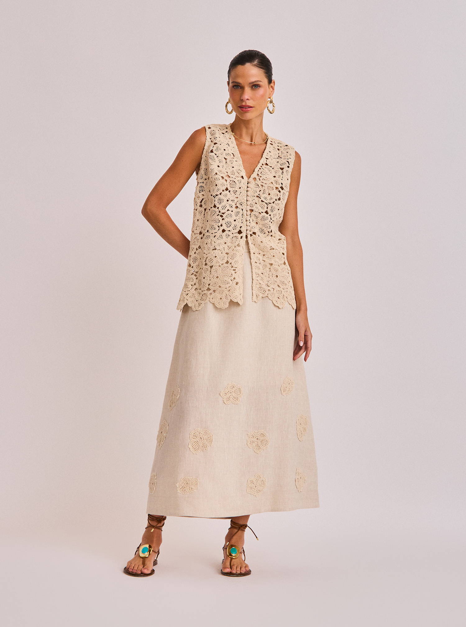 Confeccionada em 100% linho e com forro interno em algodão, a Saia Godê em Linho Puro é uma peça que une a nobreza natural do linho ao cuidado artesanal. Ela oferece conforto, frescor e elegância no caimento. O destaque está nas aplicações handmade em renda, desenvolvidas dentro de um processo de upcycling criativo, que reforça a identidade consciente e sofisticada da marca. O shape godê garante movimento fluido e atemporalidade, enquanto o cinto no mesmo tecido adiciona charme e versatilidade ao styling. Mais do que uma saia, ela traduz o equilíbrio entre artesanato e modernidade, perfeita para mulheres que valorizam exclusividade, consciência e estilo refinado.