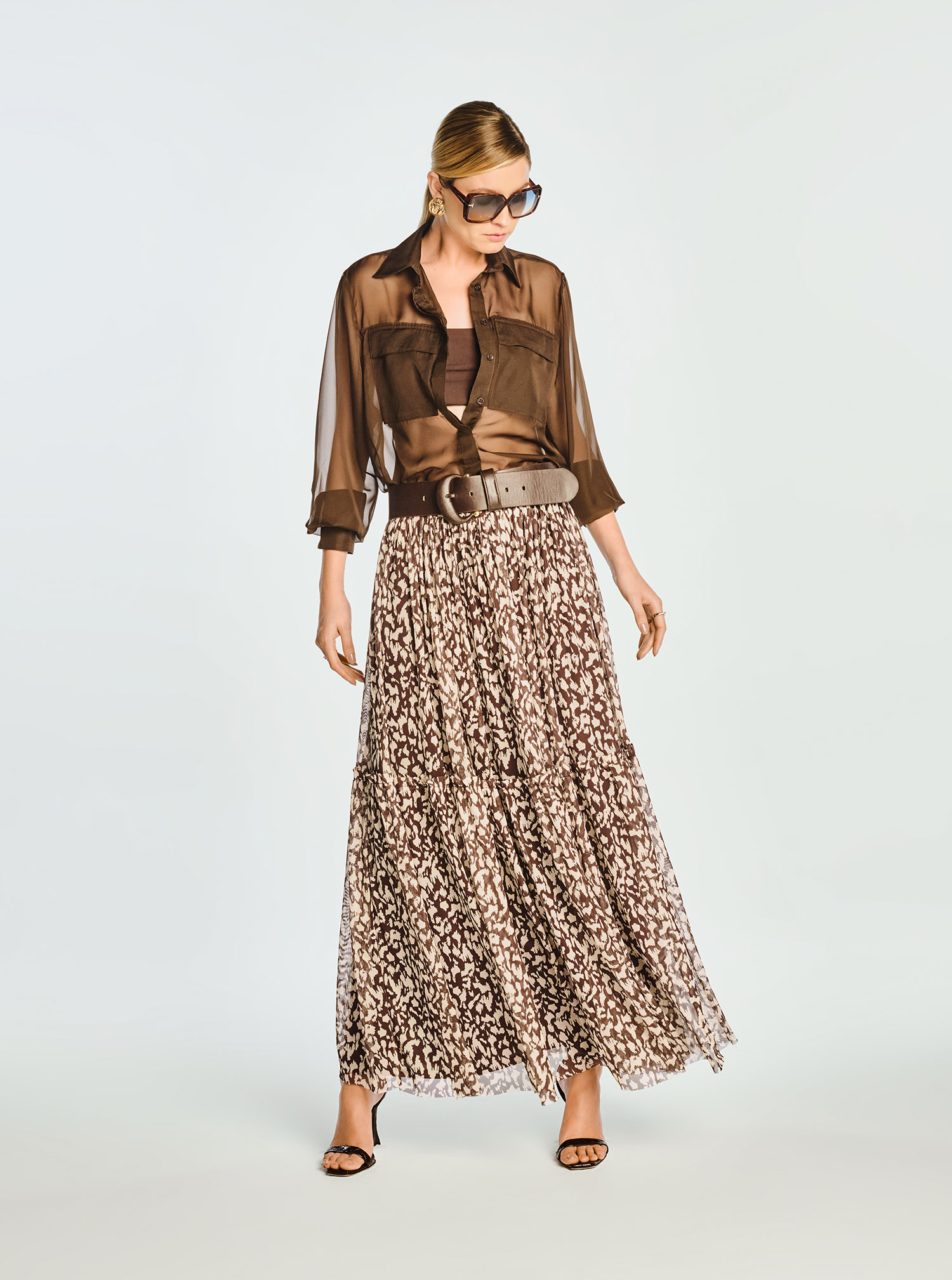 Esta saia longa feminina é a personificação da leveza, feminilidade e estilo contemporâneo. Confeccionada em tule leve com estampa exclusiva marrom, ela confere movimento e sofisticação ao visual. O shape rodado e o recorte com babado franzido adicionam fluidez e charme à silhueta. O cós com elástico garante um melhor ajuste ao corpo. O grande diferencial é o forro longo removível, que permite duas formas de uso: com forro, para conforto e discrição; sem forro, para uma transparência sutil e moderna, ideal para produções fashion com hotpant. Uma peça elegante e versátil que transita com facilidade entre o dia e a noite.