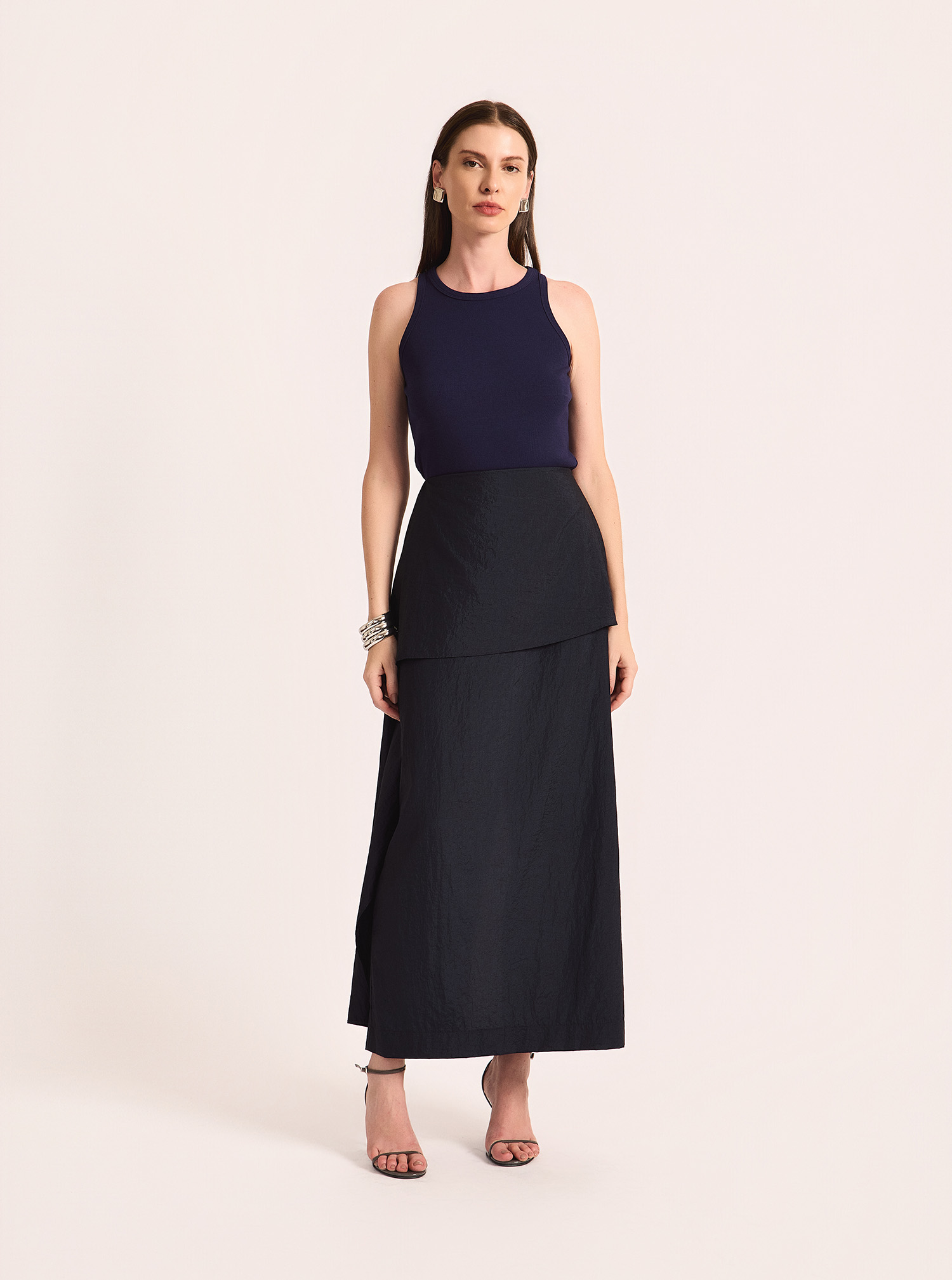 Saia confeccionada em tafetá, que une elegância atemporal e sofisticação em uma proposta refinada. O tecido leve e estruturado, com acabamento levemente acetinado, confere um visual elegante e contemporâneo. O modelo apresenta comprimento midi e cintura alta, valorizando a silhueta, enquanto a sobreposição frontal assimétrica adiciona modernidade e movimento à peça. A modelagem reta garante caimento alinhado, tornando a saia ideal para looks formais ou produções contemporâneas no dia a dia.