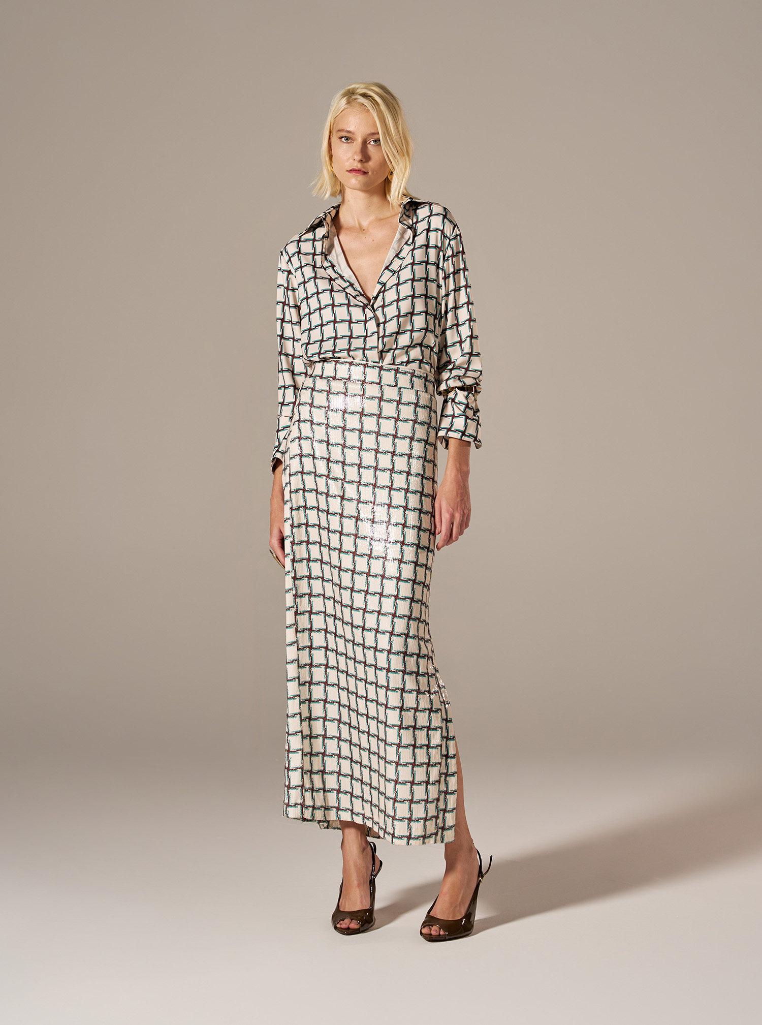 A estampa que parece brilho sofisticado traz modernidade e elegância à peça. A modelagem reta valoriza a silhueta com elegância e leveza. A cintura alta reforça o design elegante e versátil, permitindo diferentes formas de uso e combinações.