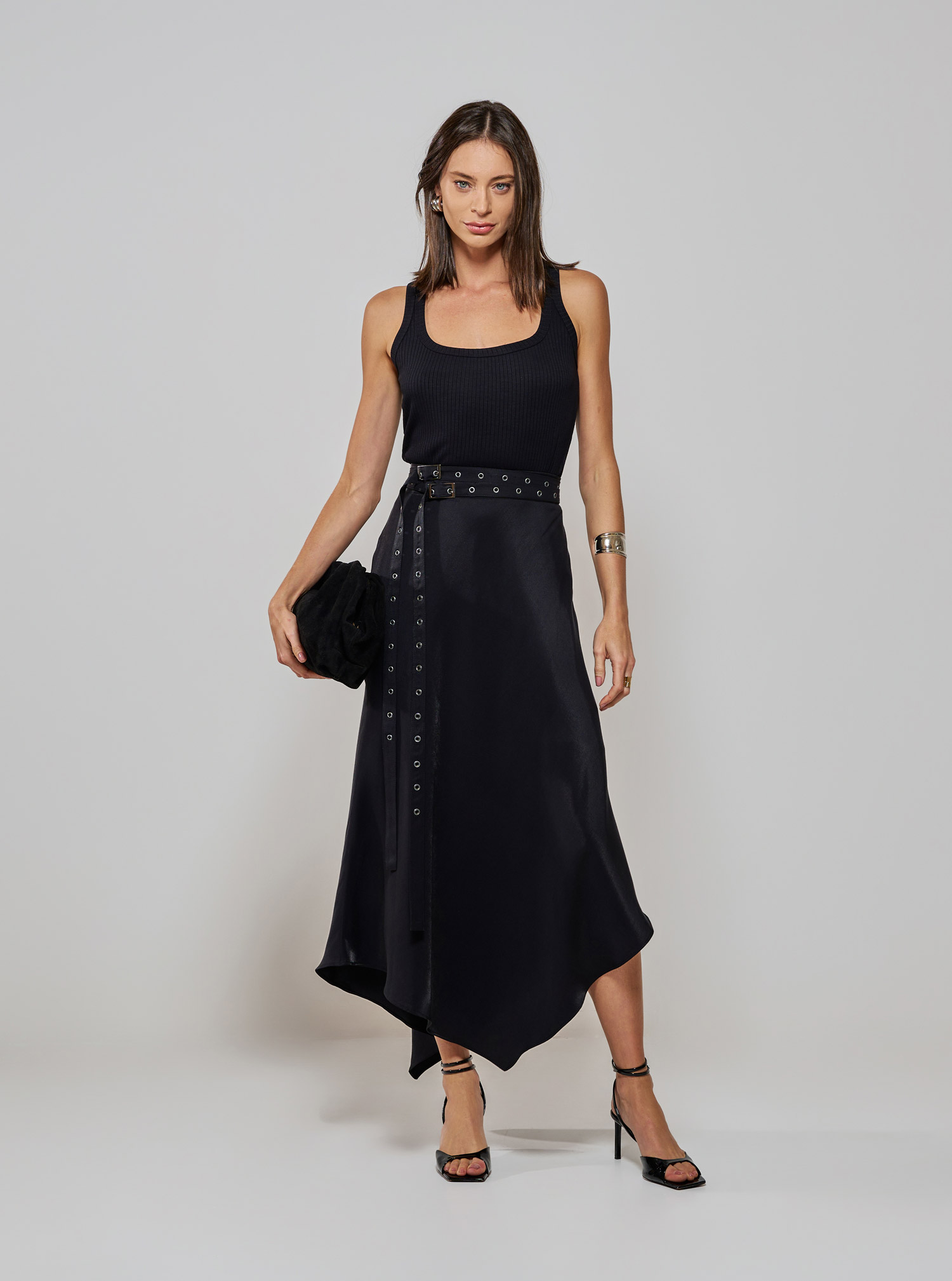 Com estilo contemporâneo e super moderno, a saia midi assimétrica é confeccionada em alfaiataria shine - tecido que traduz beleza, leveza e caimento impecável com fluidez. A modelagem em corte enviesado valoriza a silhueta com movimento, enquanto o fechamento lateral por zíper invisível garante um acabamento refinado. A peça acompanha dois cintos finos no mesmo tecido com fivela retangular e ilhós em grafite, que adicionam um toque urbano e versátil à produção. Ideal para compor looks marcantes com elegância dentro da coleção Urban Lounge.
