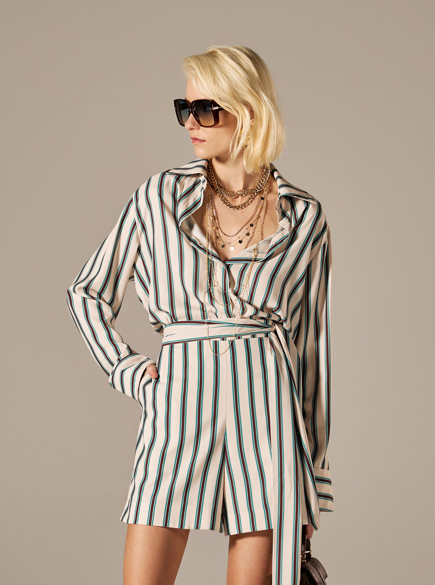 A estampa listrada vertical alonga a silhueta e traz um ar moderno e elegante à peça. O shorts apresenta cintura média com cós estruturado, proporcionando um visual moderno e sofisticado. Os bolsos funcionais com cós estruturado, proporcionando um visual moderno e sofisticado. O design das linhas valoriza a peça e garante um acabamento sofisticado.
