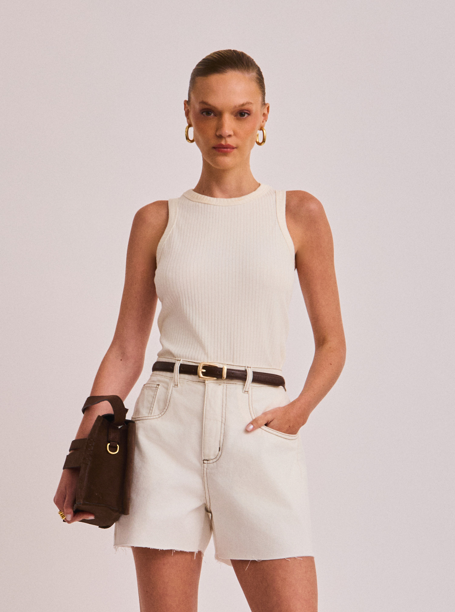 Confeccionado em sarja, este shorts une praticidade e estilo. Seu tecido resistente e durável é ideal para o dia a dia, enquanto o design de cintura alta com passantes no cós valoriza a silhueta e alonga as pernas. O fechamento com zíper e botão metálico garante um ajuste seguro e confortável. O corte curto e a robustez da sarja criam um visual equilibrado, perfeito para looks informais e de verão, combinando facilmente com blusas soltinhas ou tops ajustados.