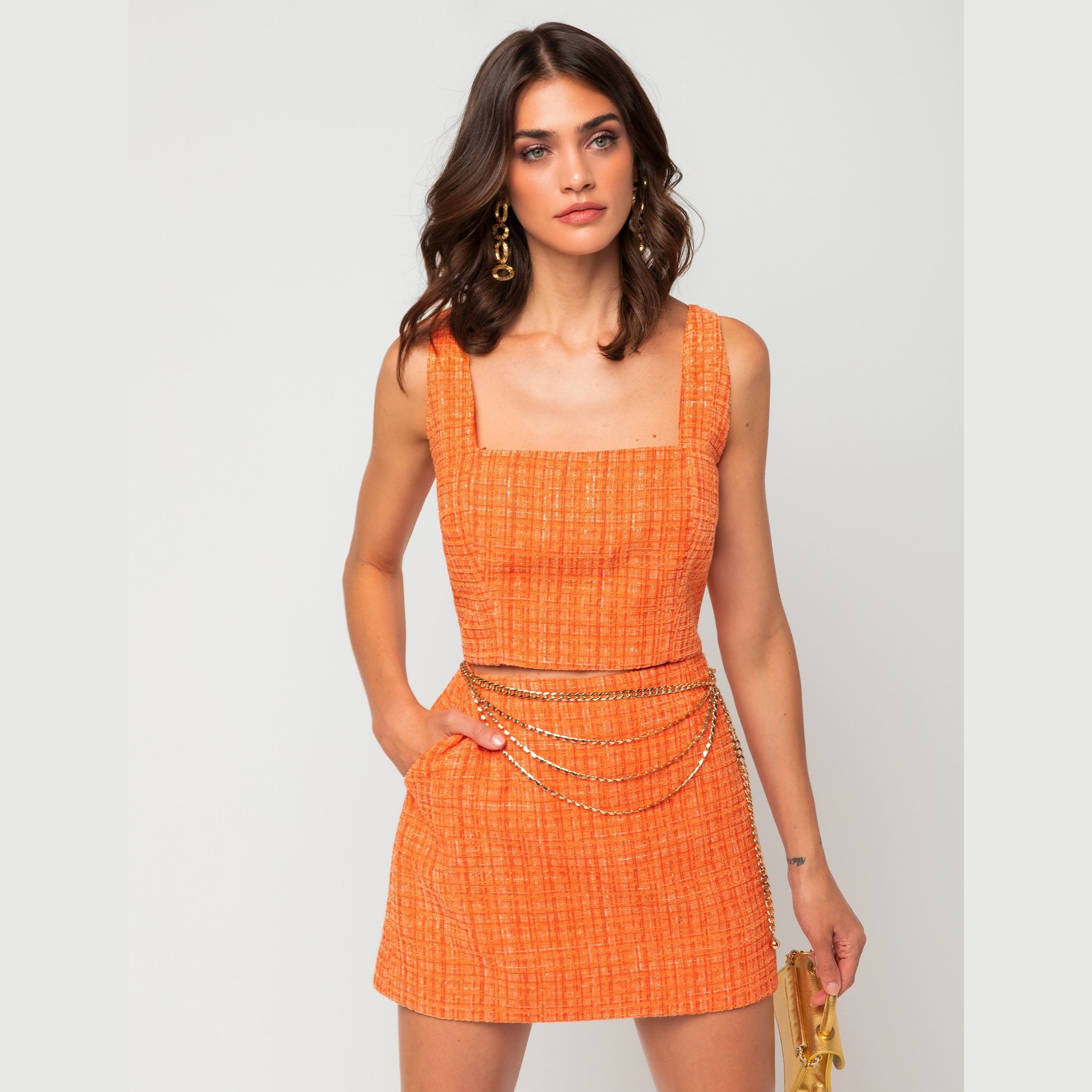 TOP LIA é a peça ideal para trazer elegância ao seu look podendo ser usado em eventos diurnos ou noturnos te deixando charmosa e bonita. Possui recortes e elásticos para melhor ajuste no corpo valorizando mais a silhueta. Confeccionado em Tweed: 96,8% Poliéster 3,2% Viscose Forro confeccionado em Cetim: 97% Poliéster 3%Elastano Detalhes da peça: Regata Comprimento cropped Forrado Elástico nas costas Ajustado no corpo Duas cores: Laranja e Rosa