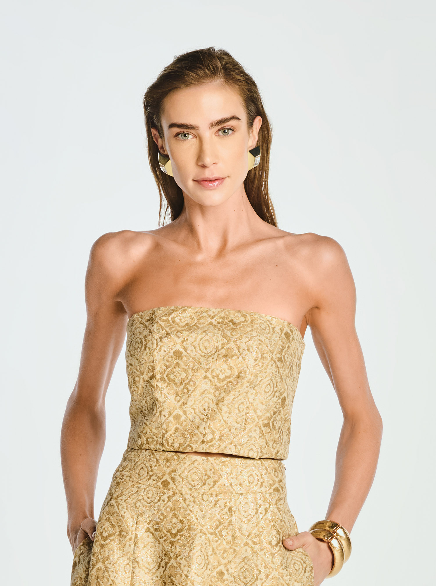 Este top feminino tomara que caia é a peça ideal para adicionar sofisticação e um toque de brilho sutil ao seu visual. Confeccionado em tecido jacquard com fio dourado, ele é estruturado e totalmente forrado, garantindo um caimento impecável e conforto. O design conta com recortes estratégicos que valorizam a silhueta, zíper posterior destacável em metal níquel e um elástico com fecho interno que garante segurança. Versátil e moderno, é perfeito para looks elegantes com alfaiataria ou propostas despojadas chic com jeans.
