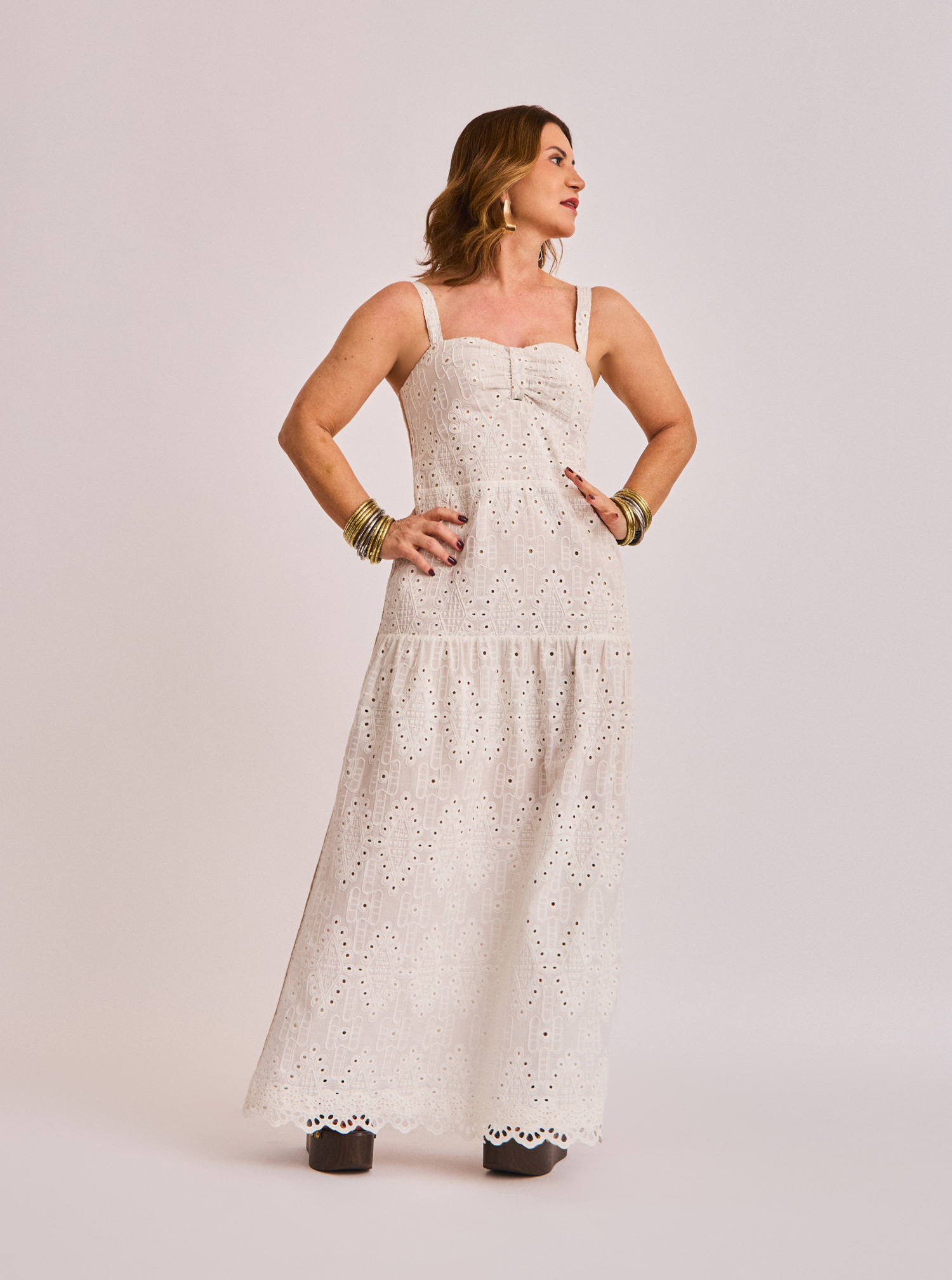 Confeccionado em laise de algodão trabalhada em desenho estilo étnico com efeito cordonê, este vestido une elegância e personalidade com um toque de modernidade esportiva. O caimento solto e o corpo alongado proporcionam leveza e sofisticação, enquanto os detalhes em cor contrastante e o acabamento artesanal tornam a peça única. Ideal para ocasiões especiais ou momentos em que se deseja um visual moderno e sofisticado.