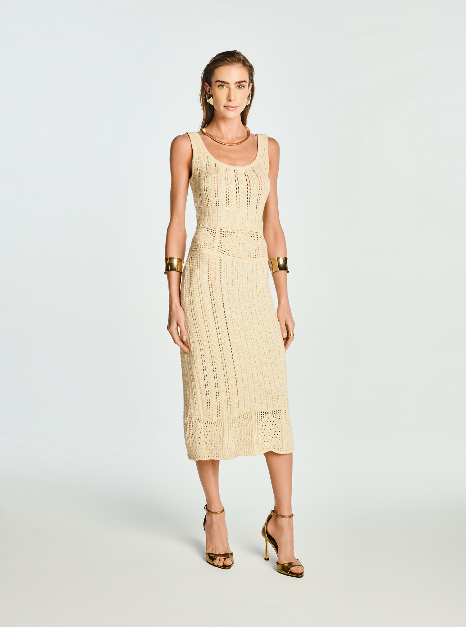 Este vestido feminino é a união perfeita entre o conforto do tricot e a elegância atemporal. Confeccionado em tricot de viscose e poliamida, ele apresenta um caimento leve e um toque macio, ideal para transitar entre diferentes ocasiões. O modelo possui comprimento midi, alças largas e decote redondo, destacando a trama delicada e elegante do trabalhado. Uma peça versátil que transita com facilidade entre o look elegante chic (com salto e acessórios) e o visual descontraído e moderno (com rasteiras). Para seu conforto e segurança, acompanha forro avulso na saia.