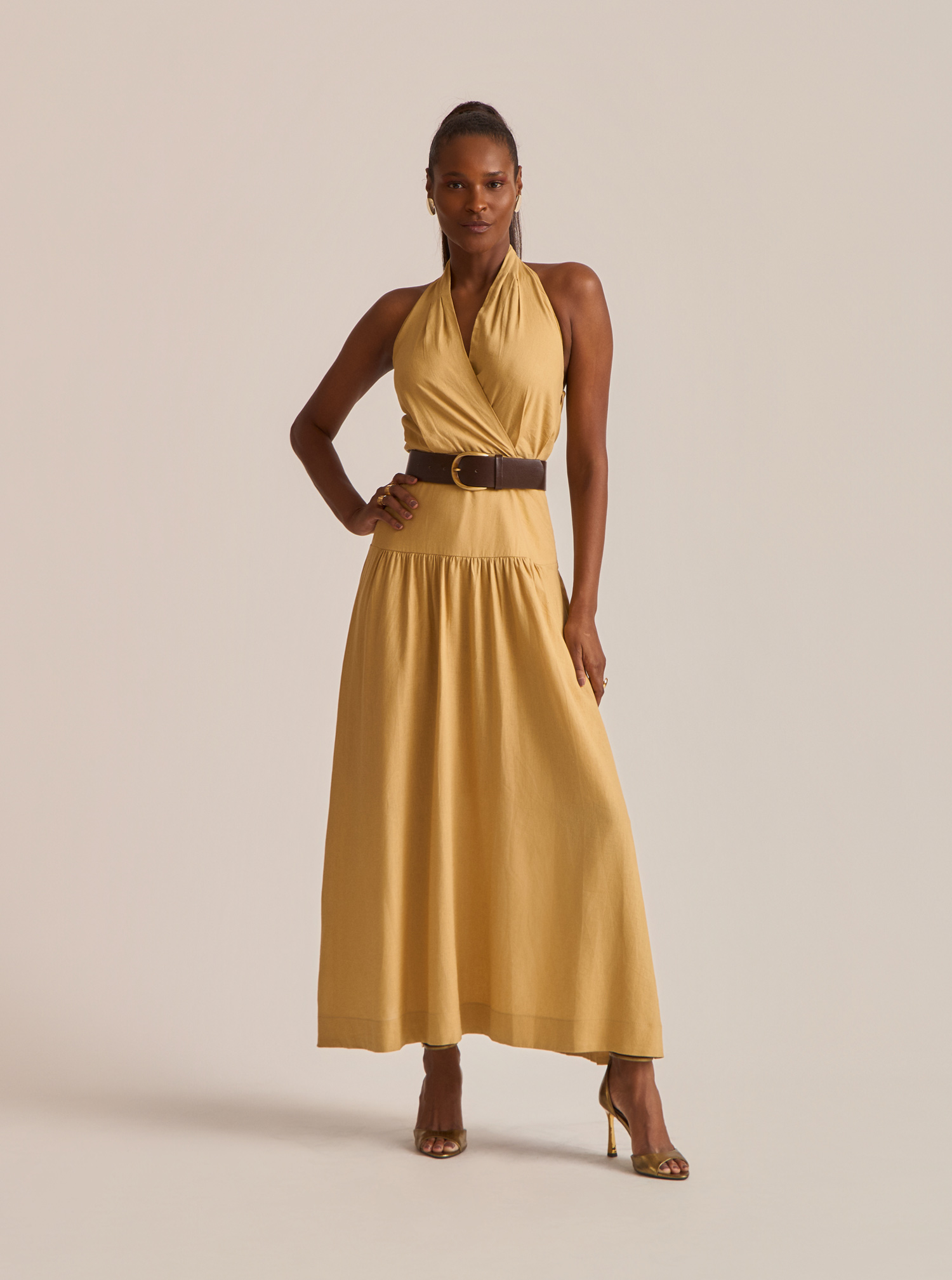 Vestido midi confeccionado em tecido nobre com base de linho, combinando elegância moderna e um toque atemporal.