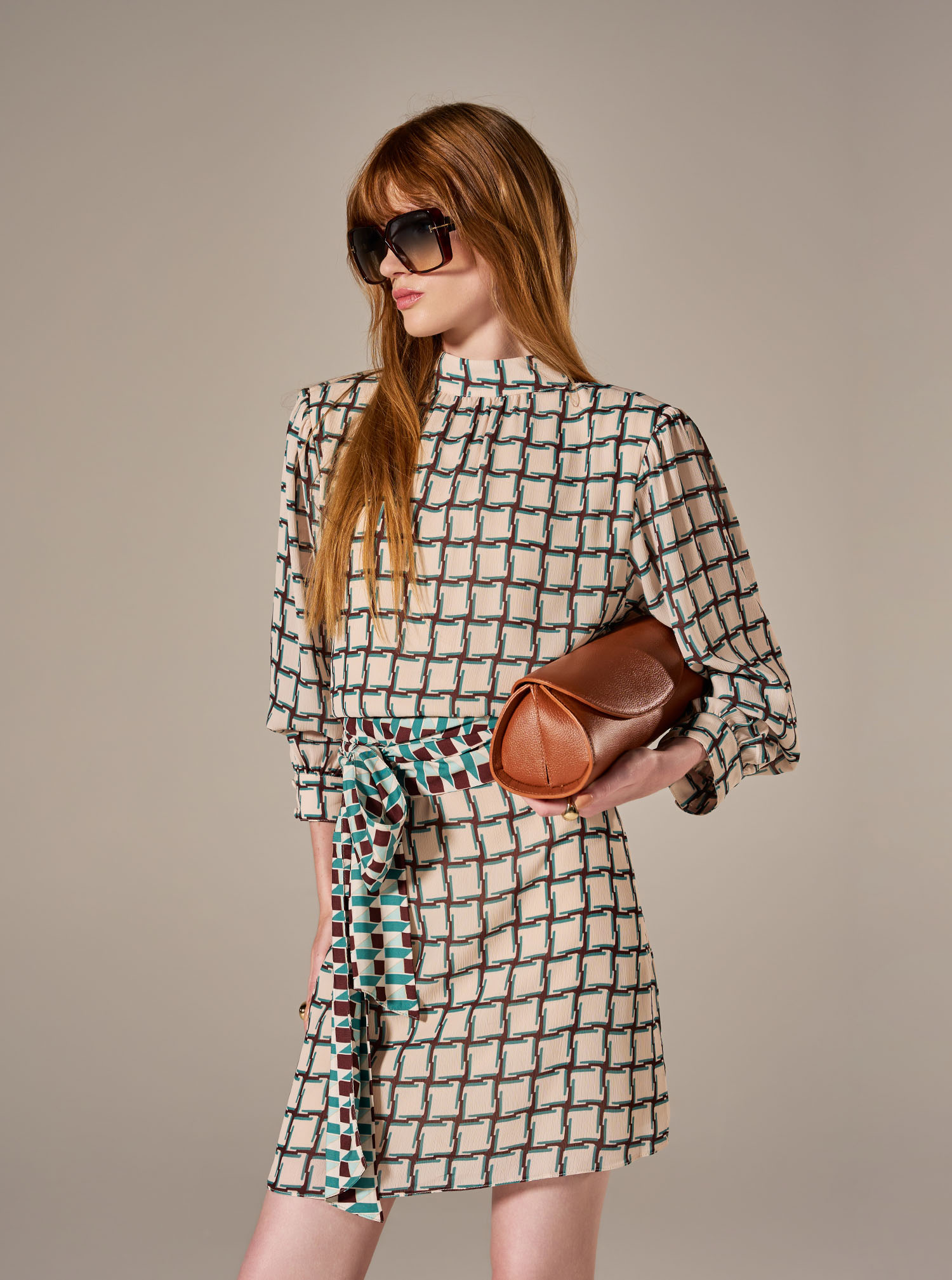 A estampa geométrica sofisticada traz modernidade à peça, criando um visual contemporâneo e refinado. O decote fechado com gola delicada confere um ar refinado e elegante, enquanto as mangas longas com punhos ajustados equilibram elegância e praticidade. A cintura é marcada por uma faixa acetinada em 97% poliéster e 3% elastano, que valoriza a silhueta, adiciona um contraste sutil de brilho e permite ajuste personalizado.